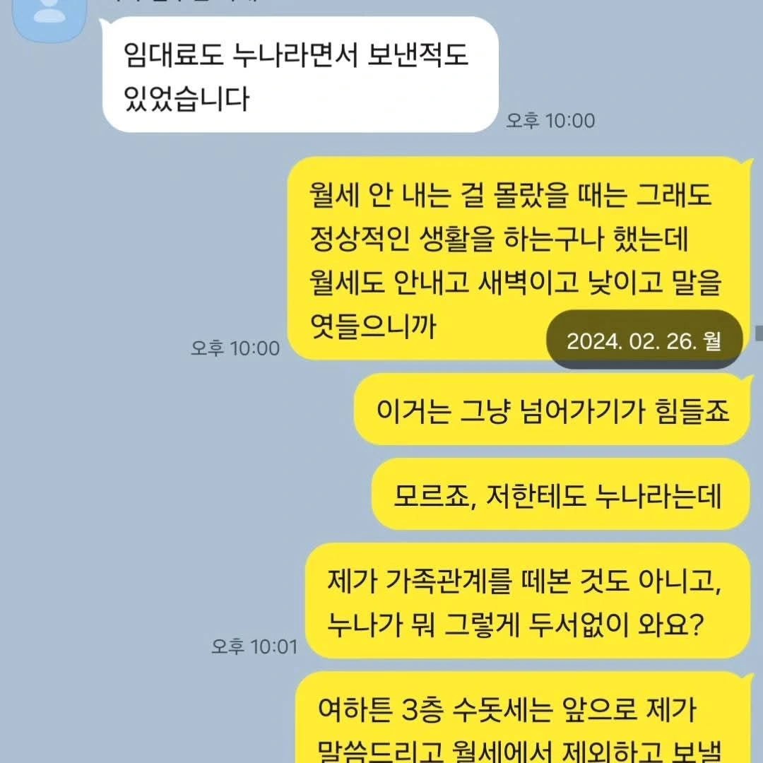 돈 문제로 3층 옥탑이 월세를 못 내는 걸 떠나 2024년에 누나 집에 들어간다고 한 날로부터 본인이 한 말을 지킬 수 없는 처지가 되자, 본격적으로 저와 신경전을 벌이며, 문제를 키웠으며, 이러한 정황을 보더라도 명백히 3층에 돈문제 등이 있고 이를 해결하지 않은 채 더 큰 범죄로 눈 가리고 있다 가늠이 됩니다.