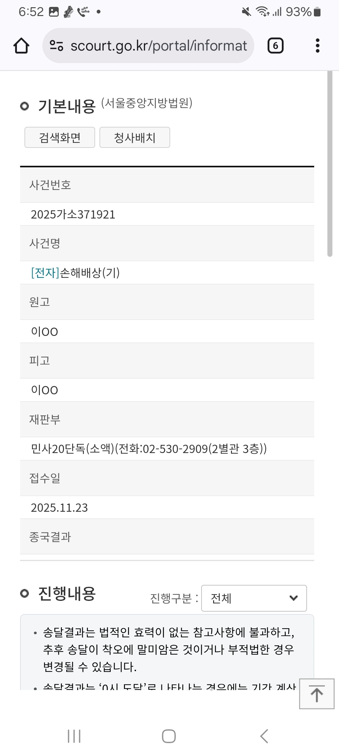 원고와 피고가 이00으로 됐는데, 원고에 제 이름을 넣어서 사건번호와 서울중앙지방법원을 검색하거나 피고에 이재명을 넣어서 마찬가지로 사건번호와 서울중앙지방법원을 검색하면 되고, 나중에 이재명 대통령 이름으로 답변서가 오면 그 때 다시 올리도록 합죠.