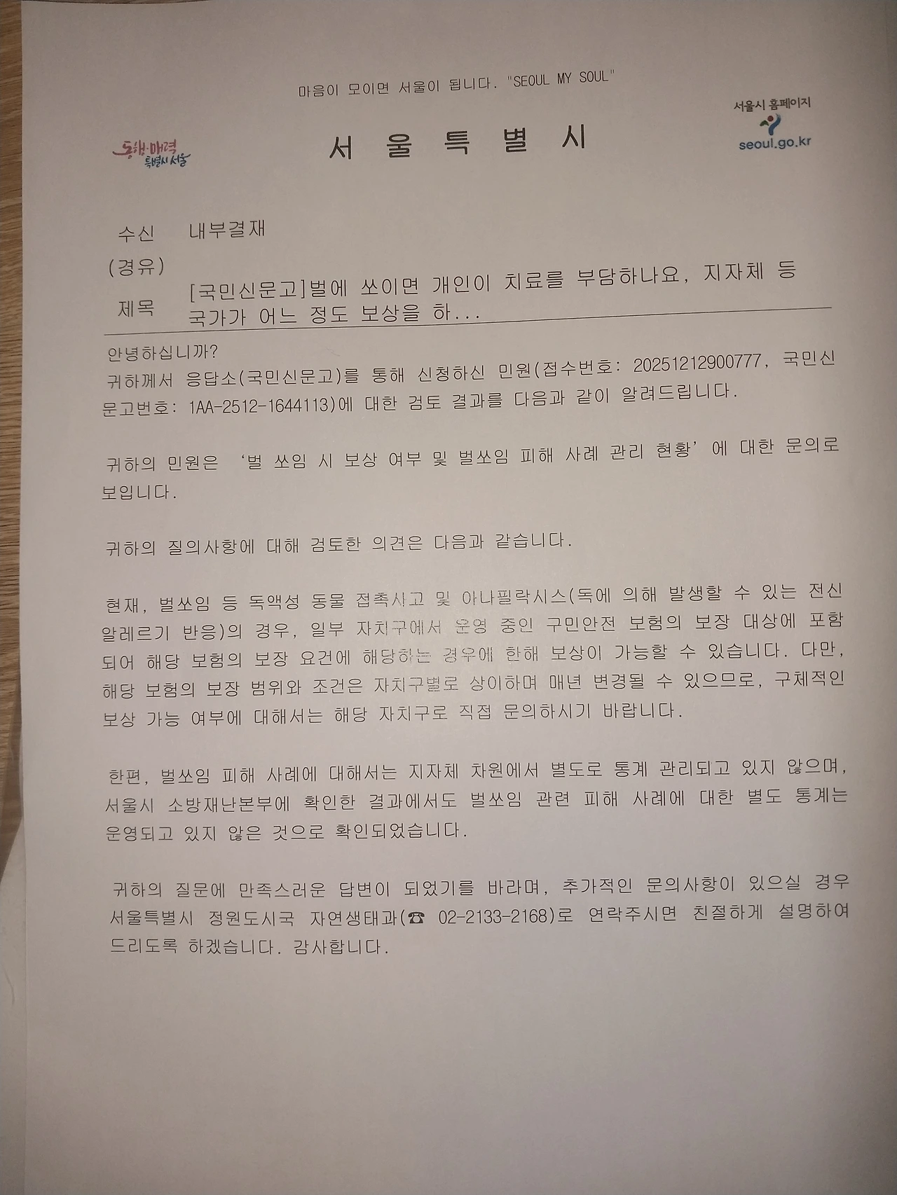 그러면서 실제 지자체에서 벌 쏘임 관련 민원이 어떠한가 조회하니, 구 차원에서 일부 안전 보험으로 보장하긴 하나 서울시 자체에서 벌 쏘임을 보장하진 않고, 벌은 소방청 관활이라 소방청에도 문의하니, 벌 쏘임을 따로 정리하여 두지 않고 있다는 내용을 들었습니다.