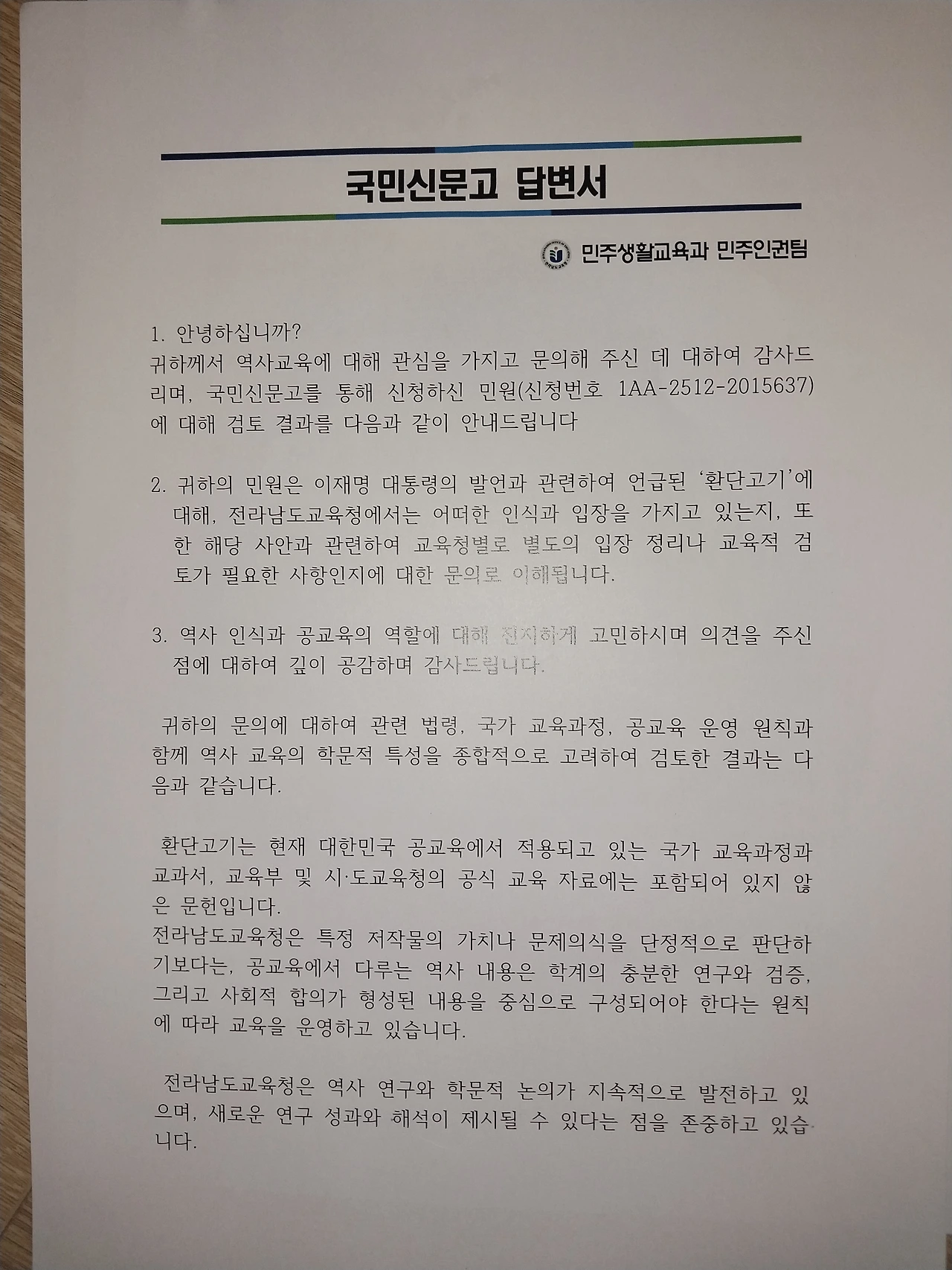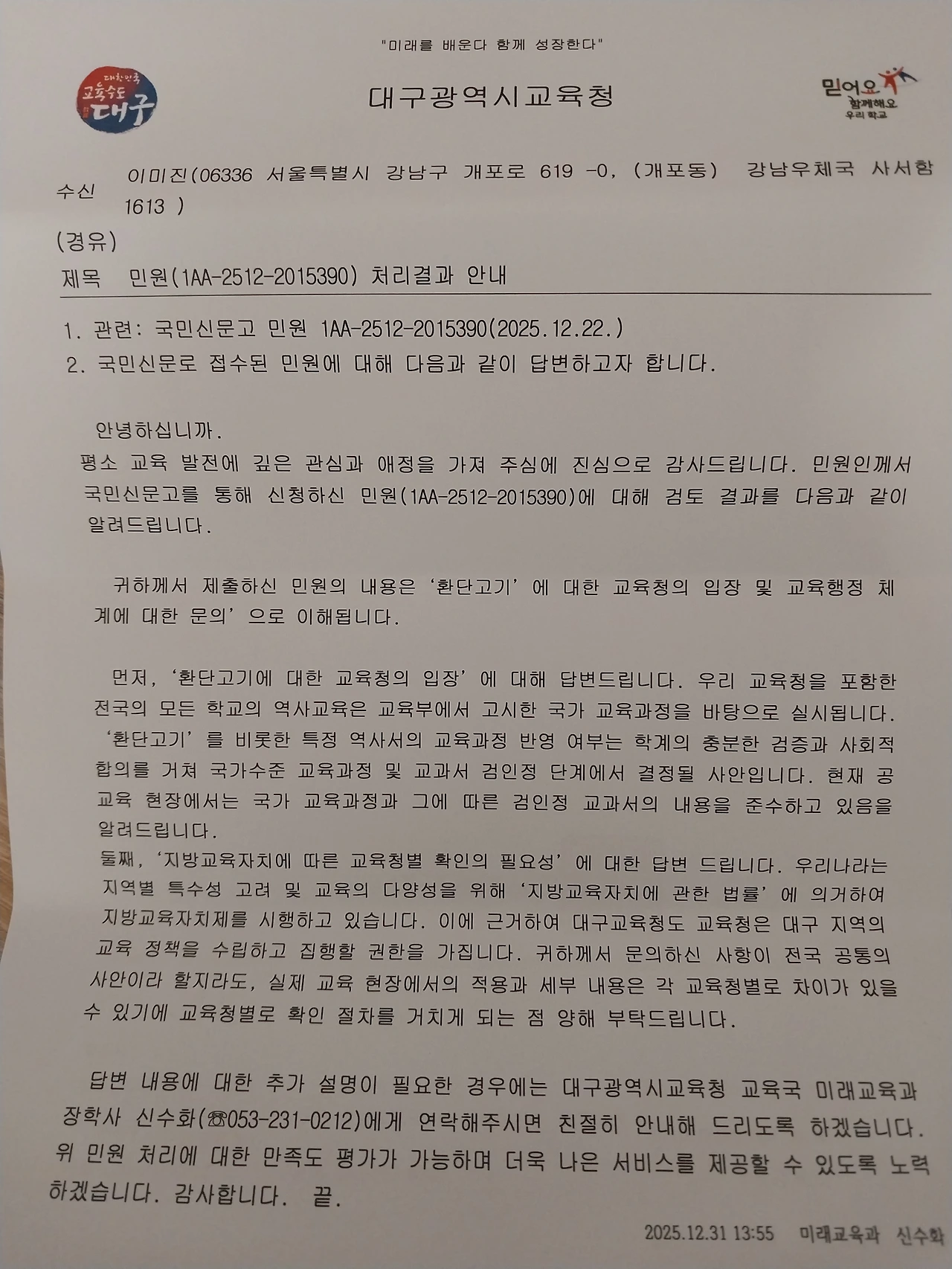 이재명 대통령의 환단고기 논란에 대해 모든 지자체 교육청에 문의한 결과, 전라남도 교육청, 경기도교육청, 세종시교육청, 대구시교육청에서 우선 답변을 주었습니다.