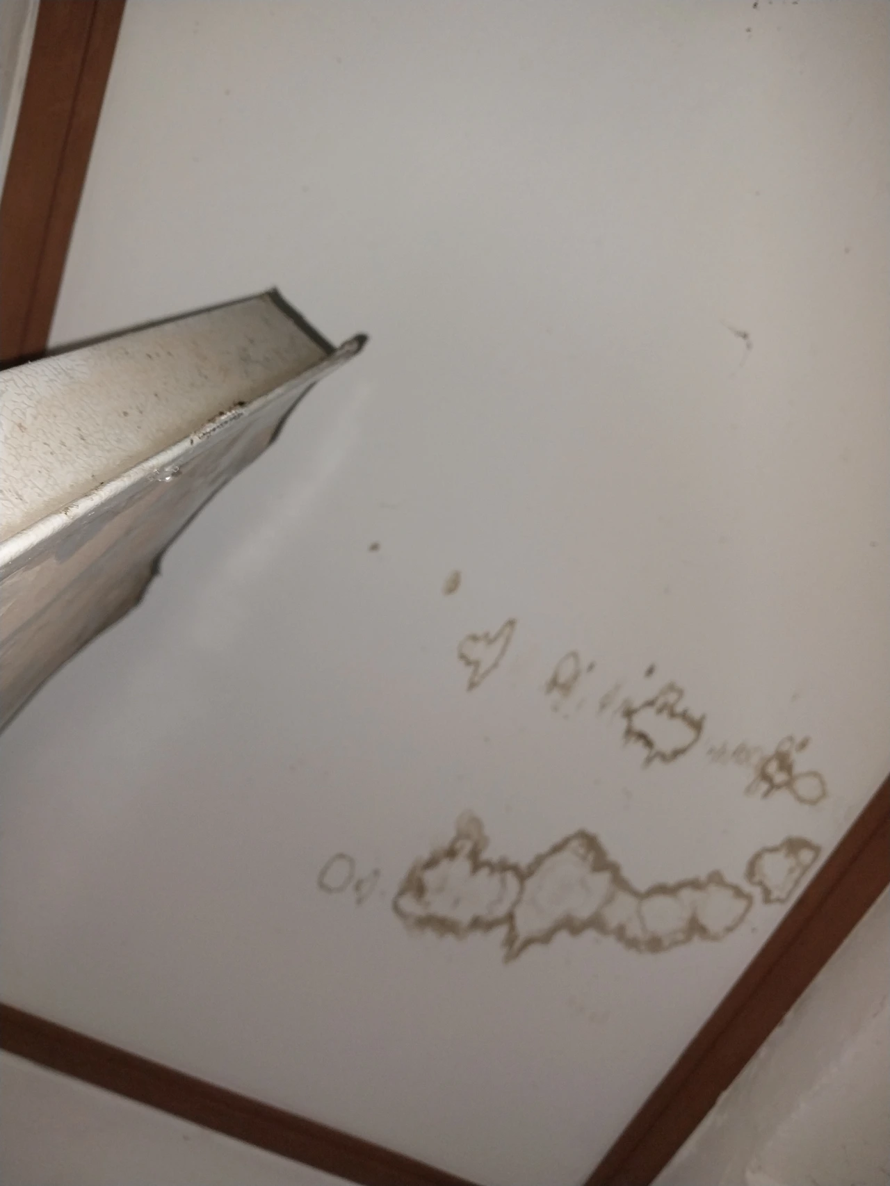이게 지금 2층 공용 복도 천장인데, 처음엔 갈색 점이 있길래 뭔가 했다가, 이 정도로 커지고부터 전기가 완전히 나가버렸습니다. 같은 천장에 전등이 달려 있는데, 누수가 심해지고 완전히 나가버려서, 문을 열면 계단이 칠흙처럼 어두워 보통 위험한 게 아니나, 집주인이 3층이 나가야 수리를 한다는 입장을 견지하고 있어서, 저도 더 이상 어쩔 수가 없는 거죠.