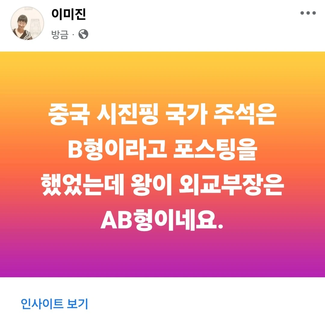 중국 시진핑은 B형, 왕이 외교부장은 AB