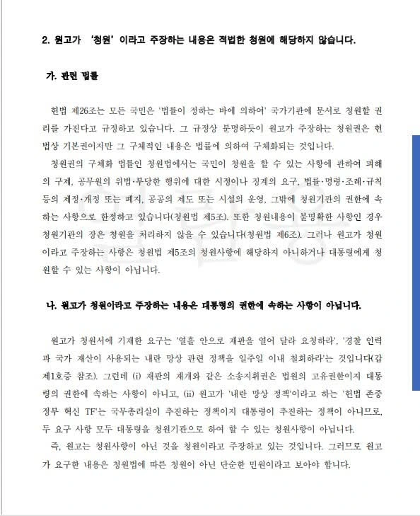 제가 이재명 대통령에게 민사를 건 부분은 가능한 빨리 이재명 대통령에 대한 재판을 속행하고 내란 뒤에 숨어 정치를 엉망으로 하는 걸 고쳐라는 제 청원을 무시했다(?) 정도로 요약이 될 텐데, 이에 대해서 변호사는 헌법에 청원권이 존재하기는 하나 청원법이라는 법률로서 구체화가 돼야 하고 해당 법률에는 이러한 청원이 해당하지 않는다 입니다.