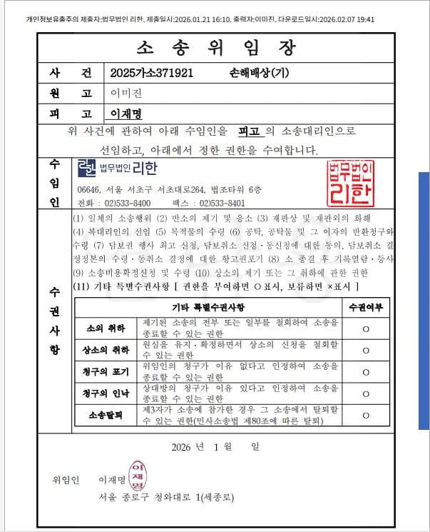 지난 번에 이재명 대통령이 민사 소송법을 위반하여 제 소장을 받은 뒤 한달 안에 답변서를 제출해야 되는 절차를 위반하고 있다고 글을 올렸는데, 지난 1월 21일에 변호사를 선임하여 대응을 준비하고 있어 다시 글을 올립니다.