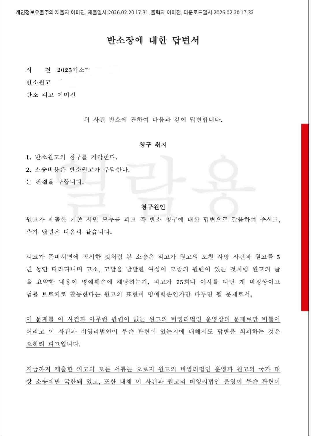 이 소송 상대방은 제가 상대방 서면을 읽고서 바로 답변서를 제출하면, 똑같은 내용으로 비디엘브이를 비방하는 서면을 바로 제출하고, 저도 상대방 서면을 받으면 바로 답변서를 제출하여, 거의 매일 답변서를 제출하느라 할 일이 꽤 많아졌는데, 결과적으로 상대방이 하는 말은 고소 및 고발과 동일한 것으로, 이제 같은 내용은 답변하지 않겠다 답변했습니다.