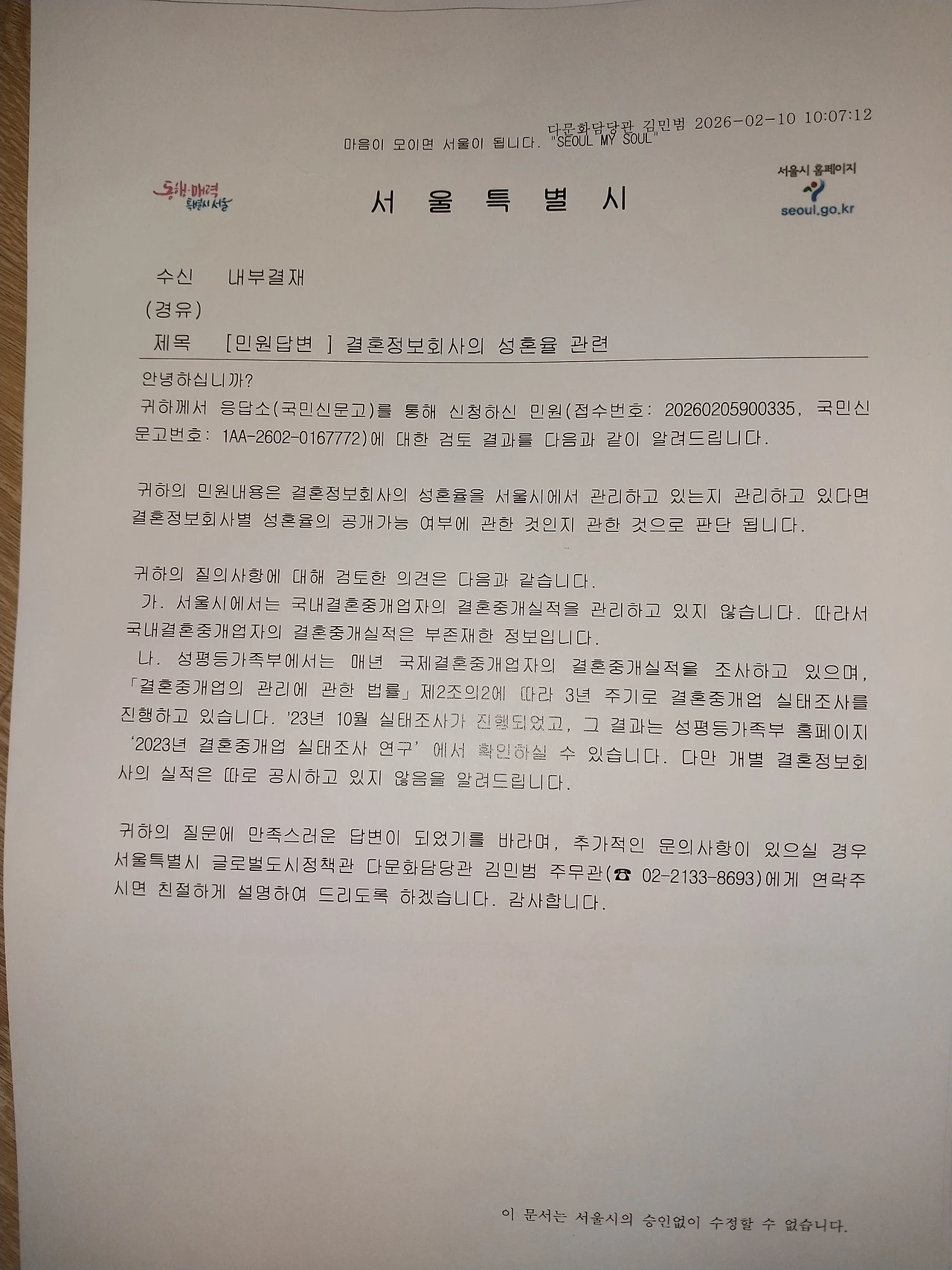 강남구청이 결혼정보회사 허가(?) 승인(?) 기관이라, 유튜브는 개인방송으로 제제할 방법이 없다고 답이 왔길래, 성혼률도 서울시에 민원을 넣으니, 성평등가족부가 관리한다고 답을 주네요.