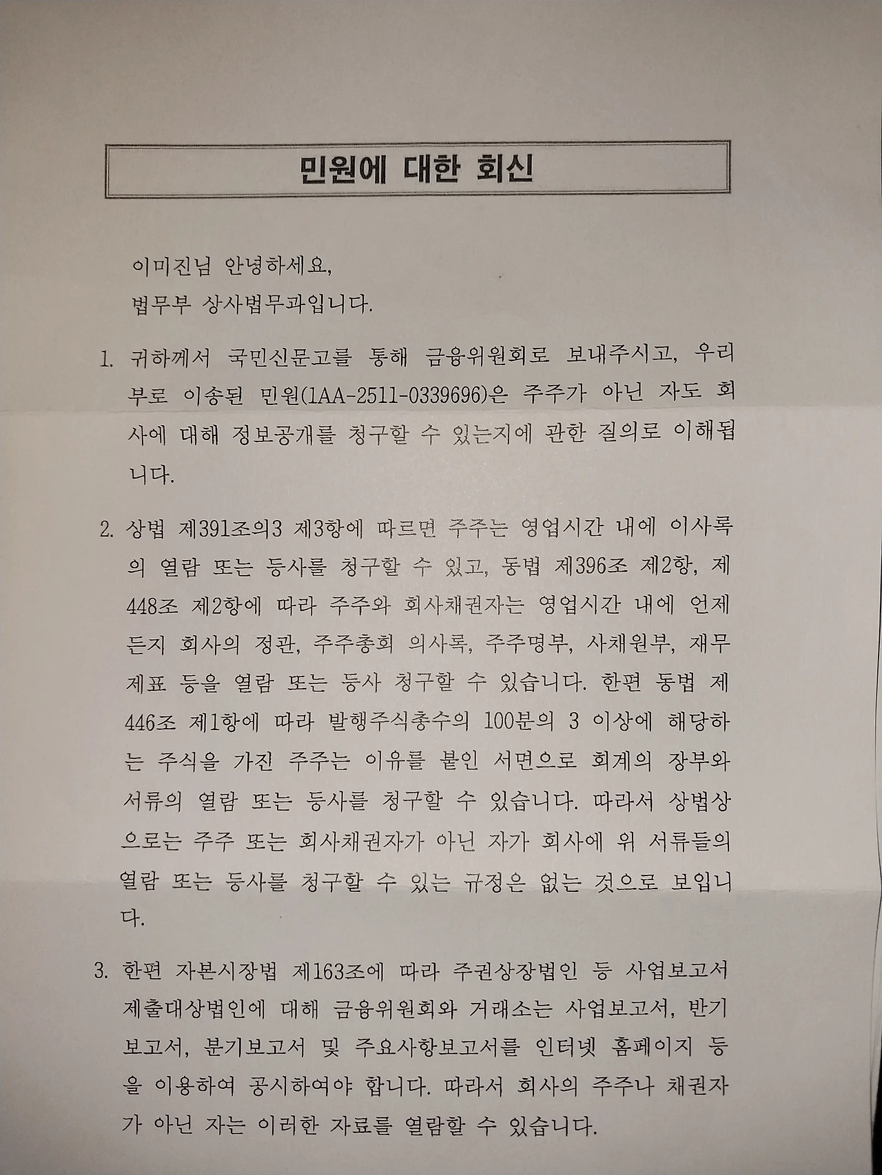이런 경우, 주주가 아닌 개인이 정보를 공개해달라 할 수 있을지, 당연히 힘들지 않을까 생각하면서도, 민원을 넣으니, 주주가 되면 얻을 수 있는 자료와 법인이면 공개해야 하는 자료가 무엇인지에 대해서만 답이 왔습니다.