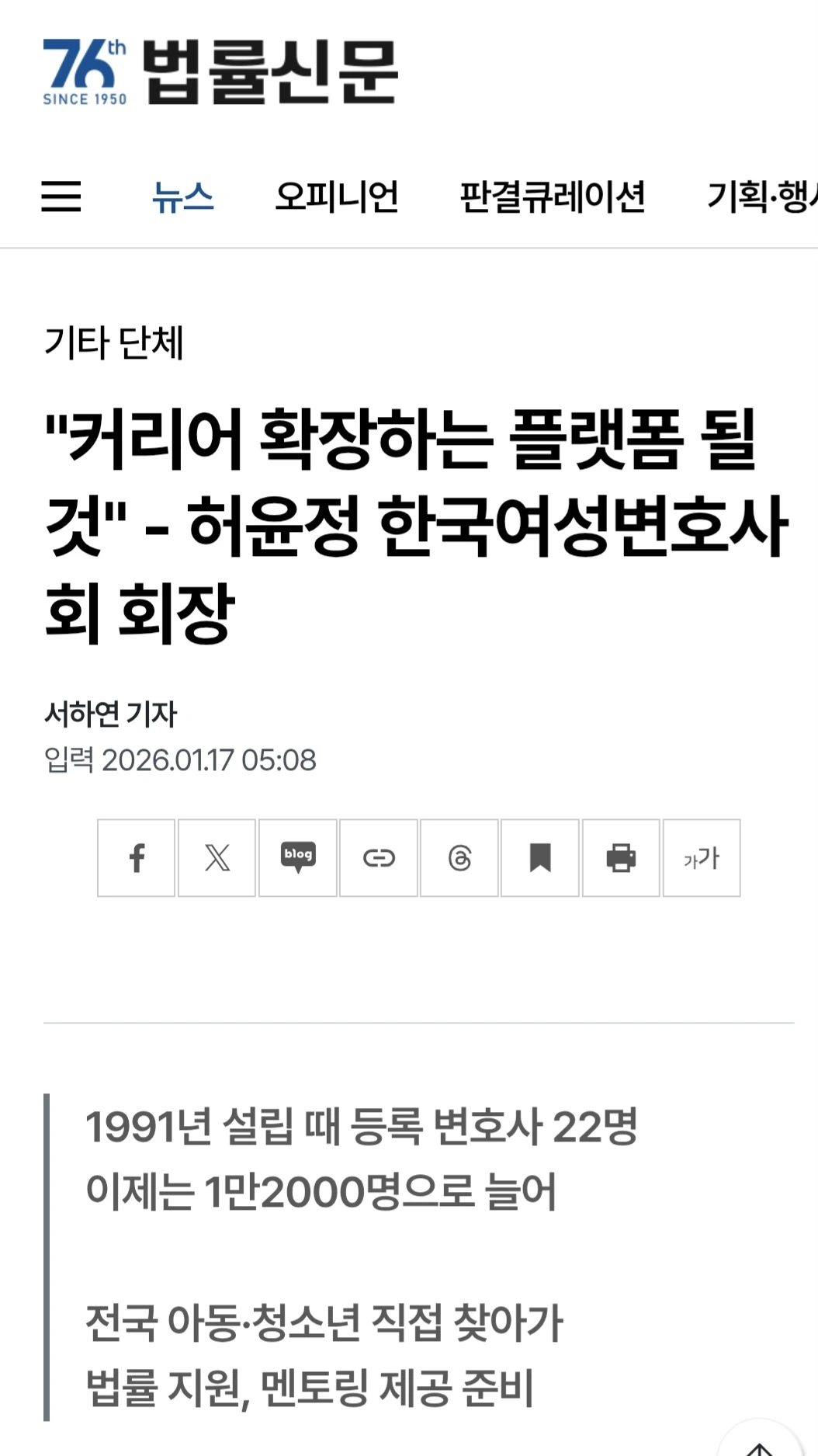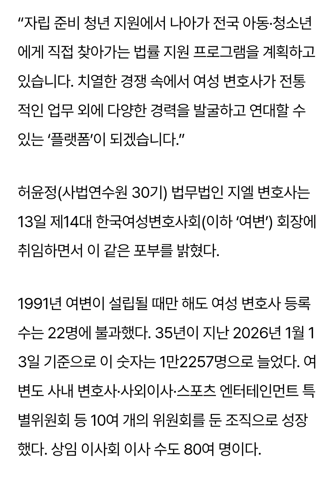여성의 사회적 지위가 올라가고 사회 참여가 지난 30년 동안 상당히 증가했다는 지표로서 여성 변호사회 변호사가 1991년 22명에서 2026년에는 1만명이 넘은 것을 보면 될 거 같습니다. 30년 사이 거의 폭증했다고 보면 되겠고요.