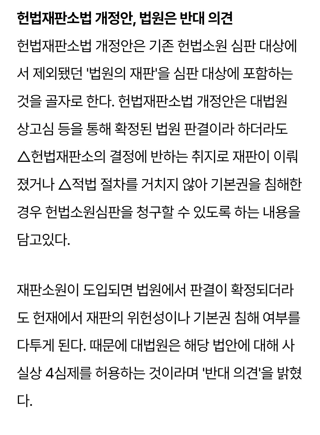 다만, 재판소원을 하는 법적 근거인데, 대법원 상고심과 같은 사유를 다시 헌법재판소에서 재판받는 게 무슨 의미가 있을지 모르겠고, (헌법재판소에서 적법 절차가 아니라고 판단하면 대법원은 망신을 당하는데 과연 그런 판단을 얼마나 실질적으로 헌법재판소가 내릴 지 모르겠다는 의미), 이럴 거면 차라리 제가 누차 말했듯 대법원 심리불속행 기각 제도를 보완하는 방식이 일반 국민에게는 훨씬 이익이 될 거 같습니다.