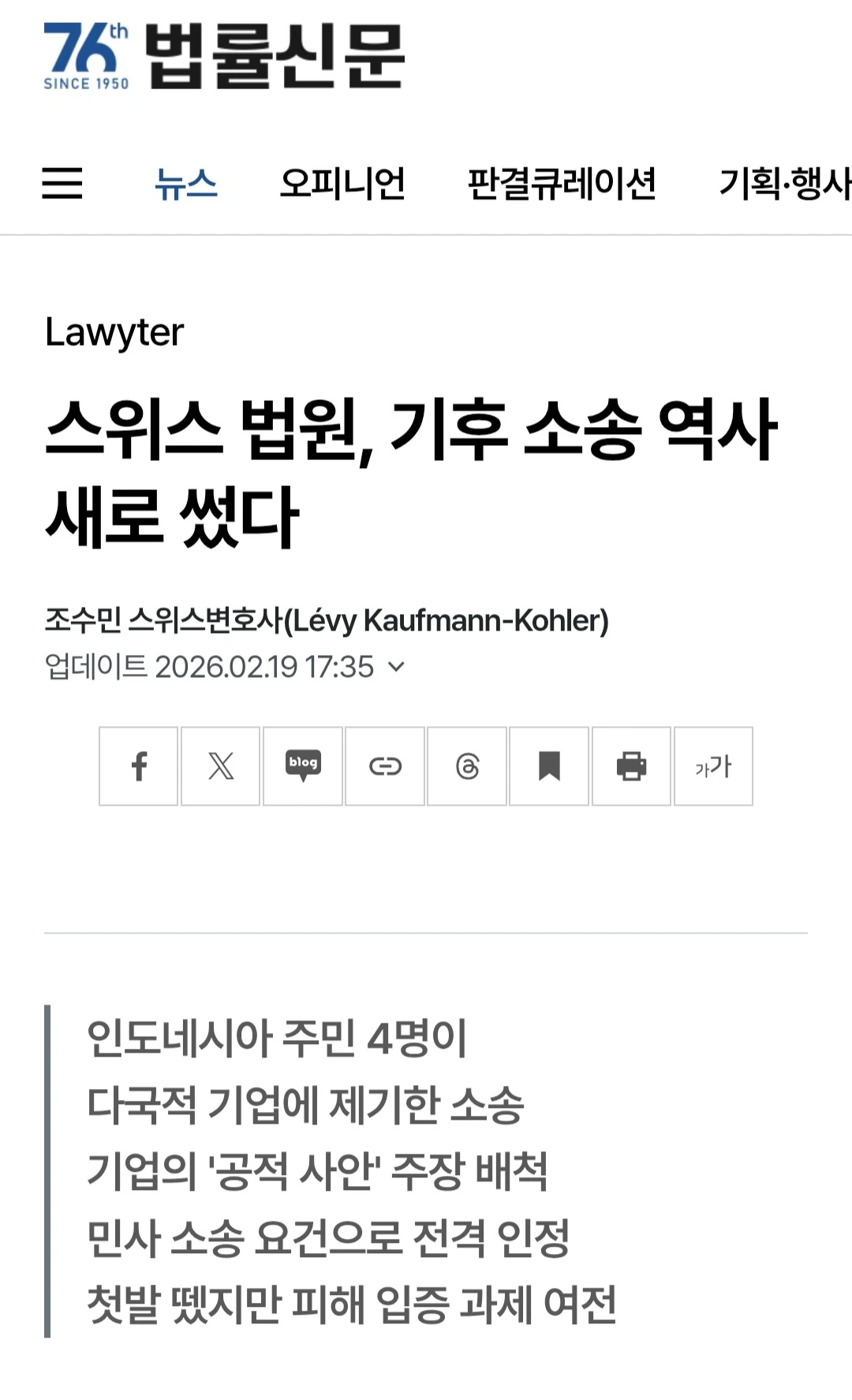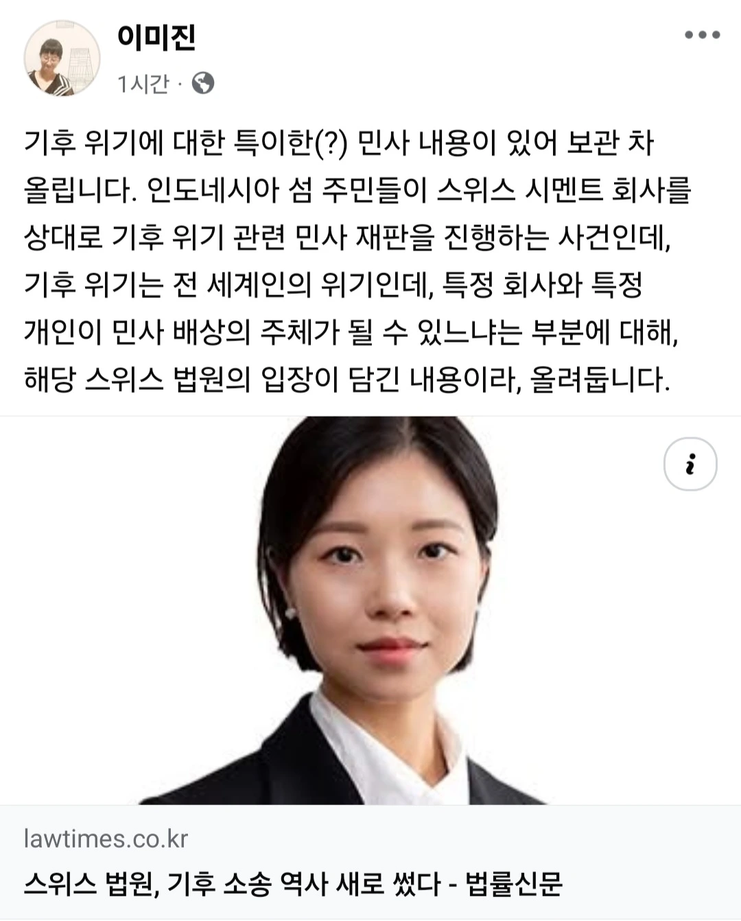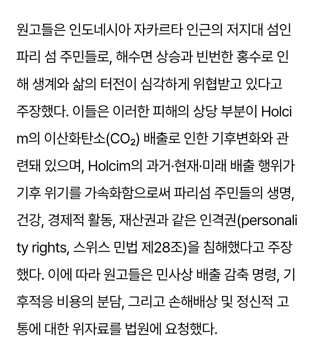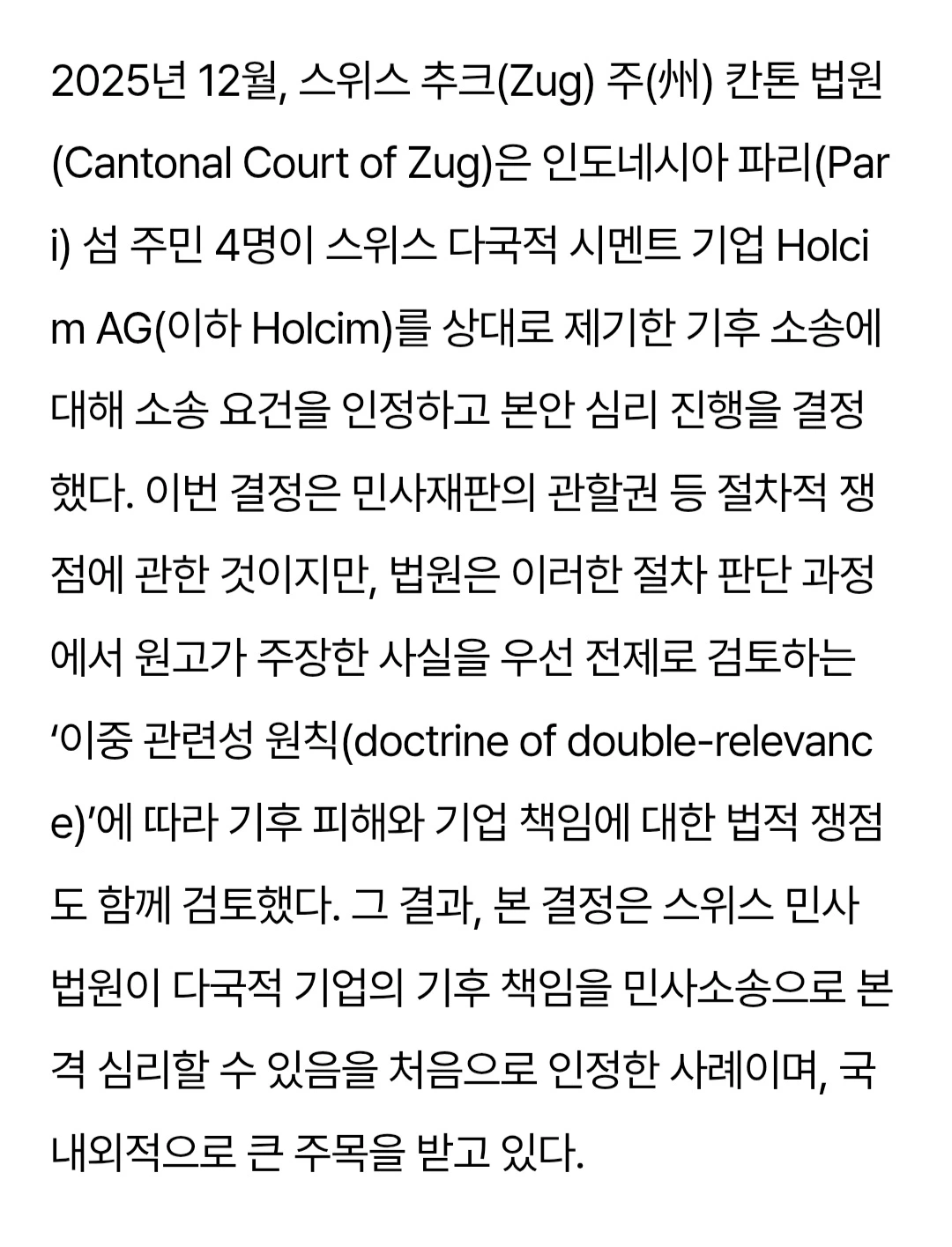 기후 위기에 대한 특이한(?) 민사 내용이 있어 보관 차 올립니다. 인도네시아 섬 주민들이 스위스 시멘트 회사를 상대로 기후 위기 관련 민사 재판을 진행하는 사건인데, 기후 위기는 전 세계인의 위기인데, 특정 회사와 특정 개인이 민사 배상의 주체가 될 수 있느냐는 부분에 대해, 해당 스위스 법원의 입장이 담긴 내용이라, 올려둡니다.