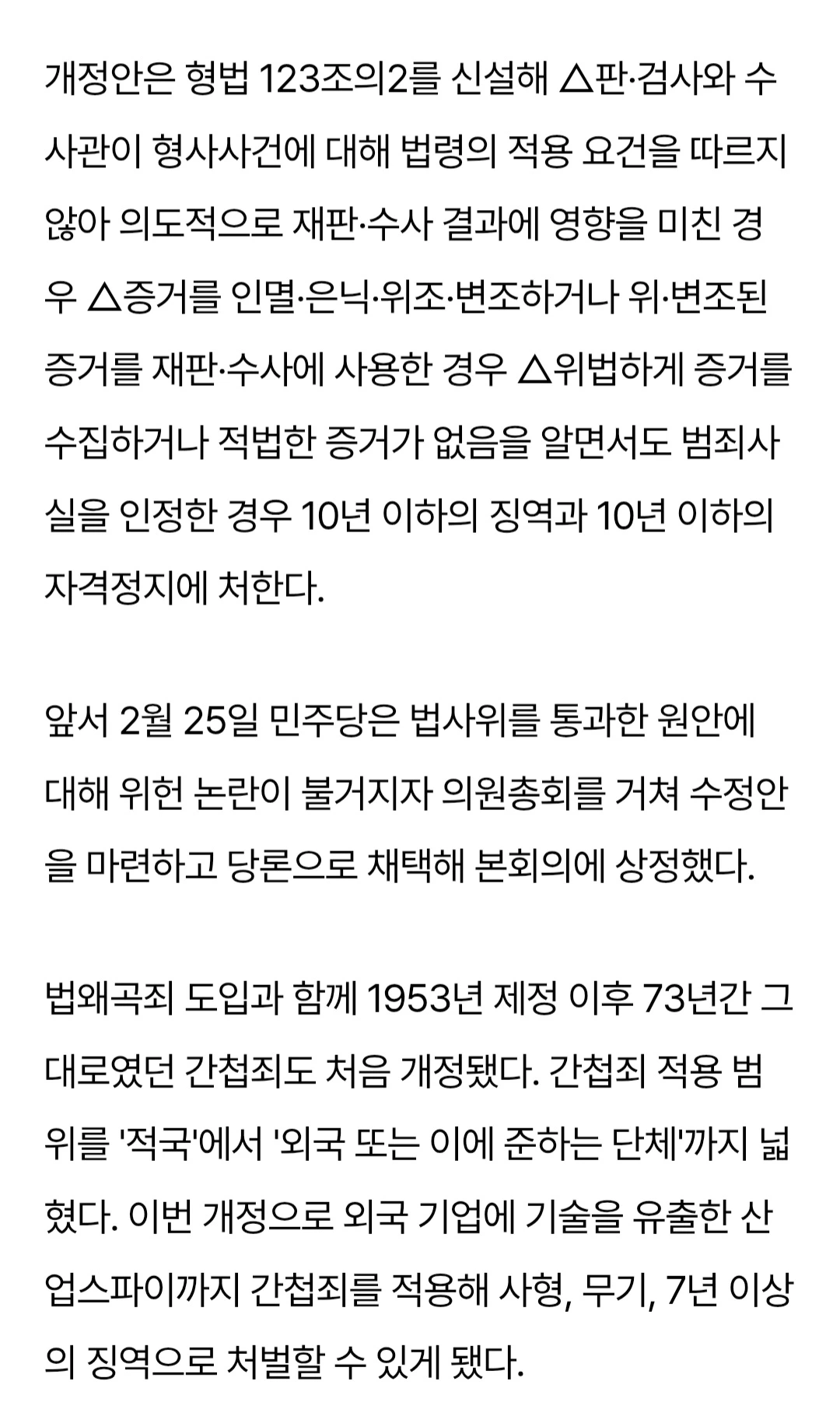 법왜곡죄에 도입되는 법률은 1)판·검사와 수사관이 형사사건에 대해 법령의 적용 요건을 따르지 않아 의도적으로 재판·수사 결과에 영향을 미친 경우 2) 증거를 인멸·은닉·위조·변조하거나 위·변조된 증거를 재판·수사에 사용한 경우 3) 위법하게 증거를 수집하거나 적법한 증거가 없음을 알면서도 범죄사실을 인정한 경우, 로서,