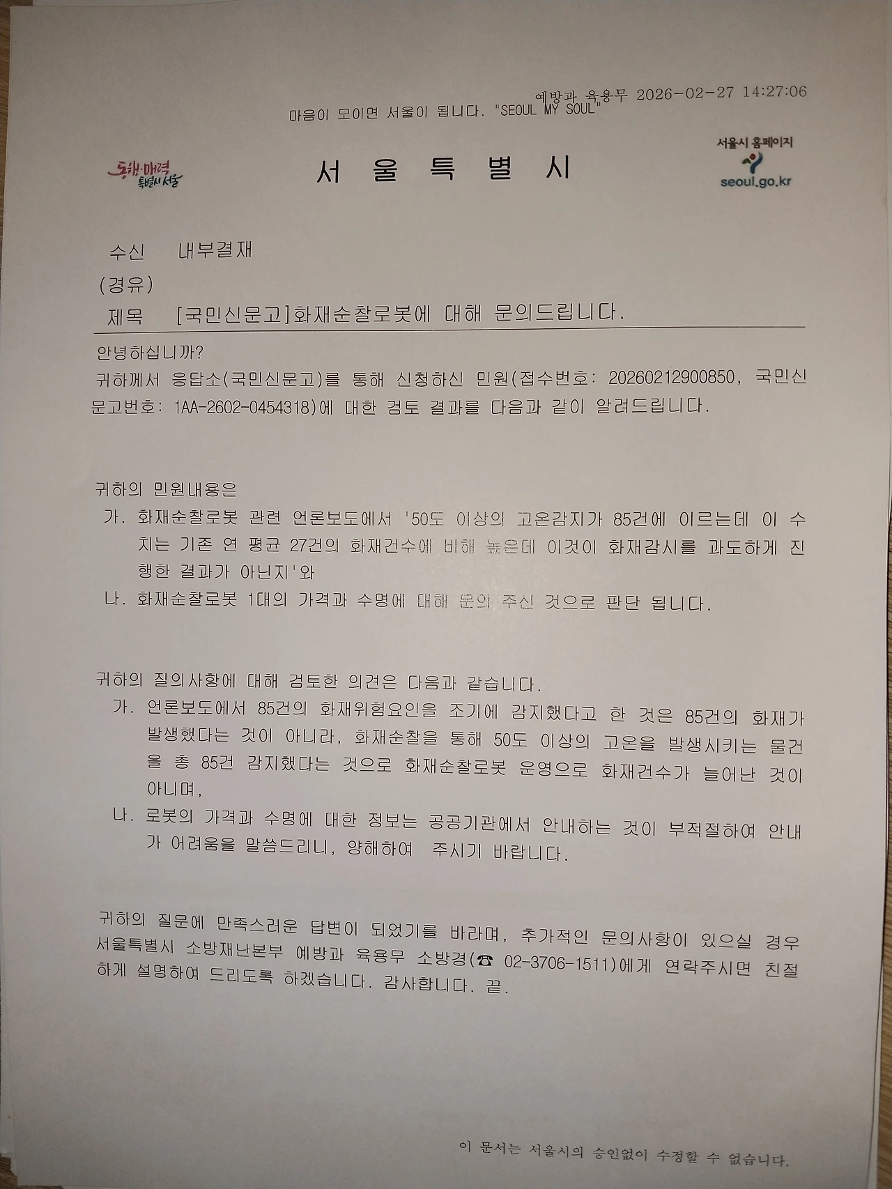 지난 번에 소방화재로봇이 85건의 화재를 예방했다고 하길래, 연 평균 27건의 화재 건수에 비한다면 다소 과한 감지가 아닌가, 화재가 나는 것보다야 과한 감지가 낫긴 하나, 서울시의 입장은 어떠한지 민원을 넣었습니다.