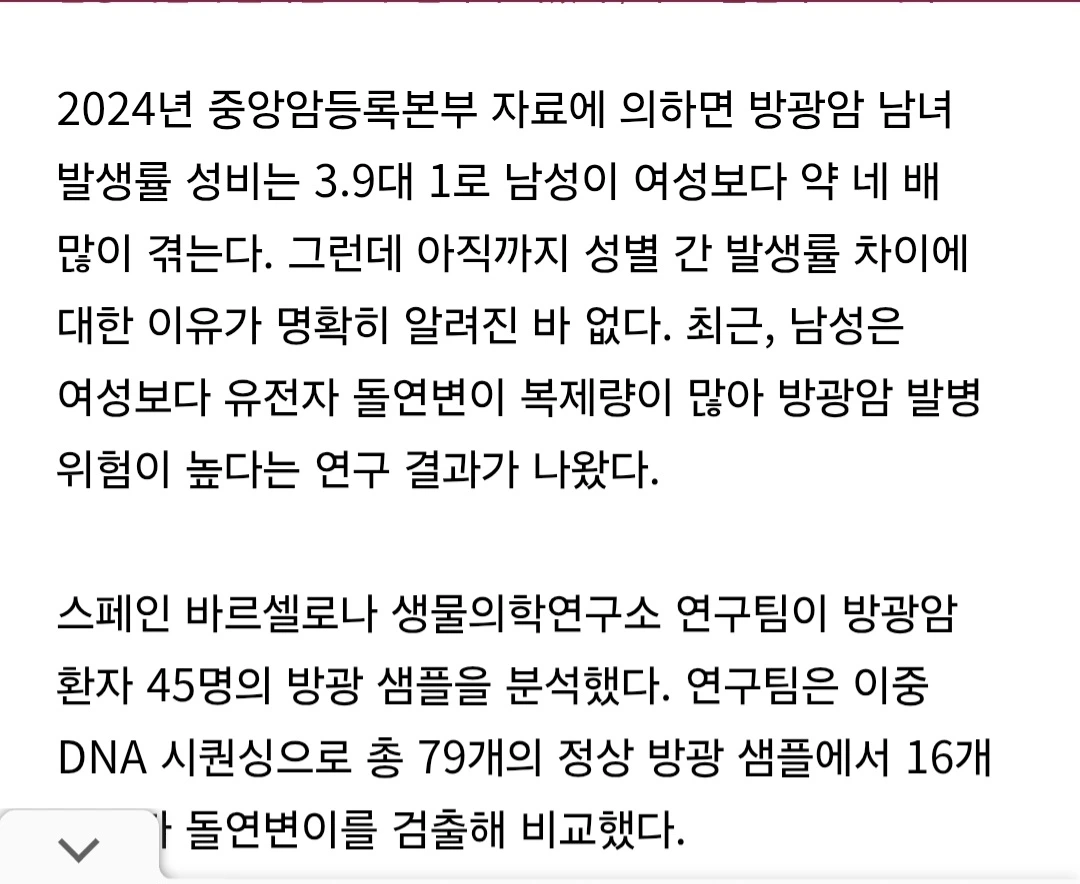 어제 생식기 주변 장기에 문제가 생기는 경우는 여성보다 남성이 높다는 취지의 글을 적고 나서 혹시 하는 생각에 찾아보니, 방광암도 남성이 여성에 비해 4배 이상 많이 걸리는 걸로 나오네요. 방광암 중 여성 환자는 20% 정도라고 합니다.