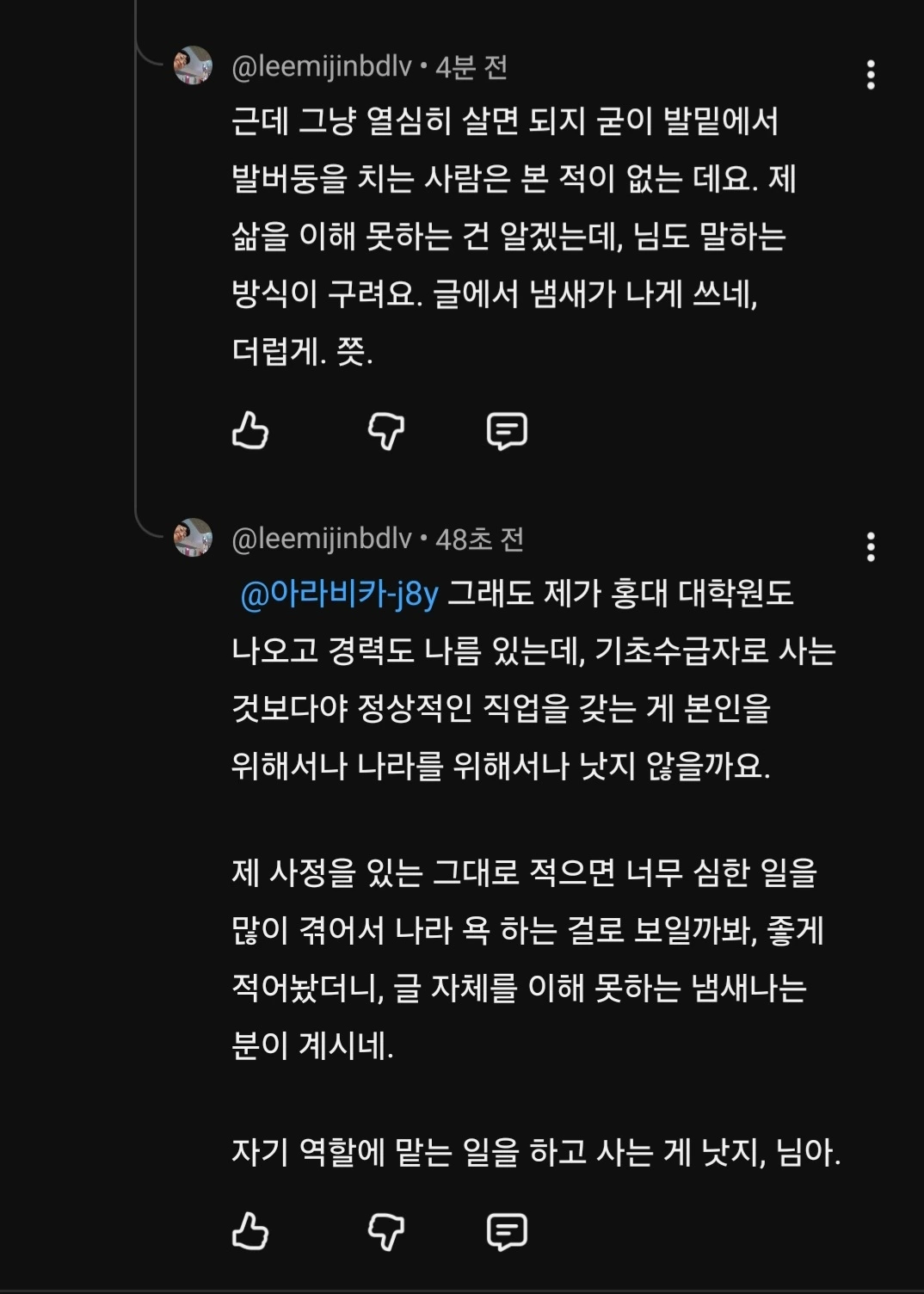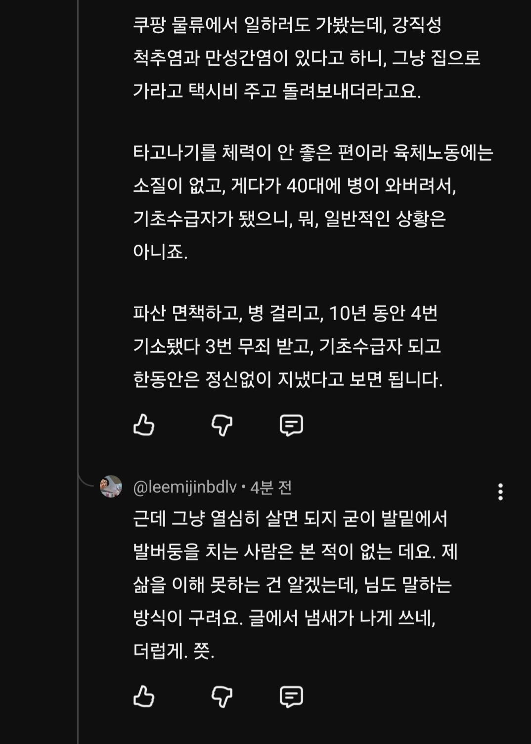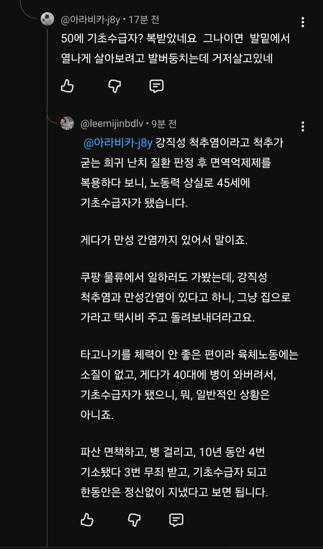 지금의 제가 기초수급자로 살고 있는 게 복 받은 거고, 이 나라가 정상일까요, 전 그렇게 안 보는데요. 일차적으로 나라가 미쳤다고 생각 함.