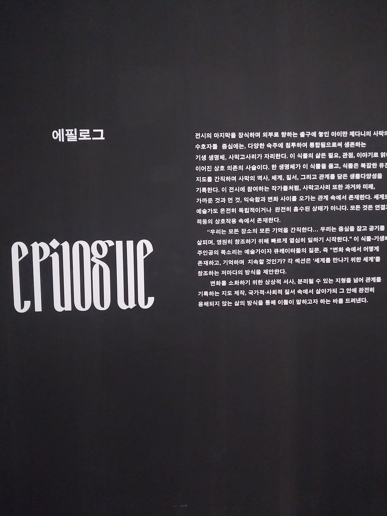 도슨트분이 설명을 잘 해주셔서 1시간이나 흘렀다는 걸 인지하지 못할 정도로 재밌었으나, 한편으로, 아랍이 다루는 공간 개념, 관계, 지구와 인간 등에 대한 작가의 통찰보다는 아랍 내 와국인인 중국인 노동자의 사망처럼 다소 정치적인 부분을 강조한 것이 아쉬웠습니다.