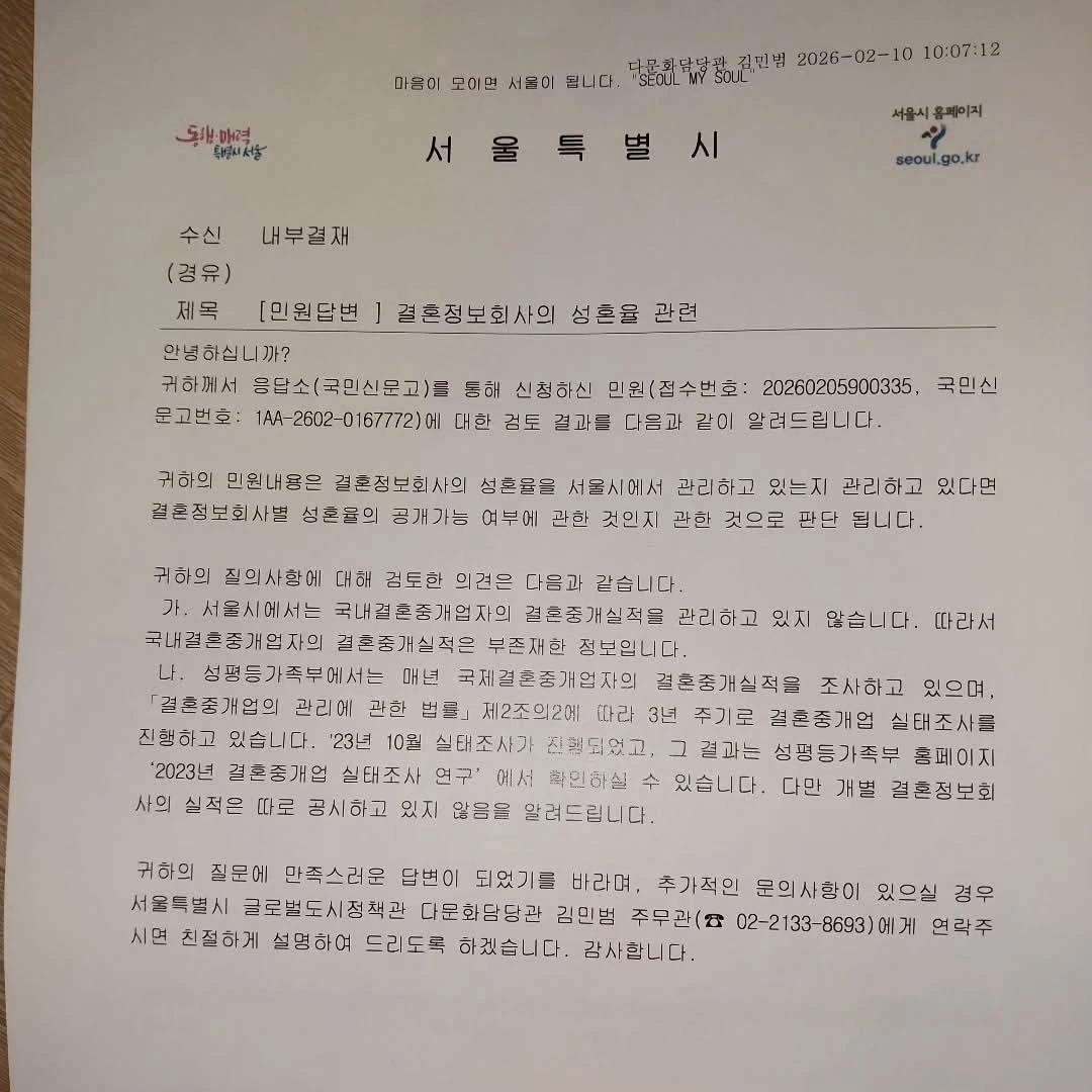 지난 번에 결혼중개업체를 결정할 때 성혼률을 보고 결정하는 게 낫다고 말한 취지가 민원에 대한 결과였는데, 오늘 민원 답변에 있는 결혼정보업체 관련 자료를 성평등가족부에서 실제로 찾다 보니, 민원 결과에 적시된 성혼률 관련 정보를 찾을 수가 없었고, 국제결혼실태조사만 한 게 있어, 의아하더군요.