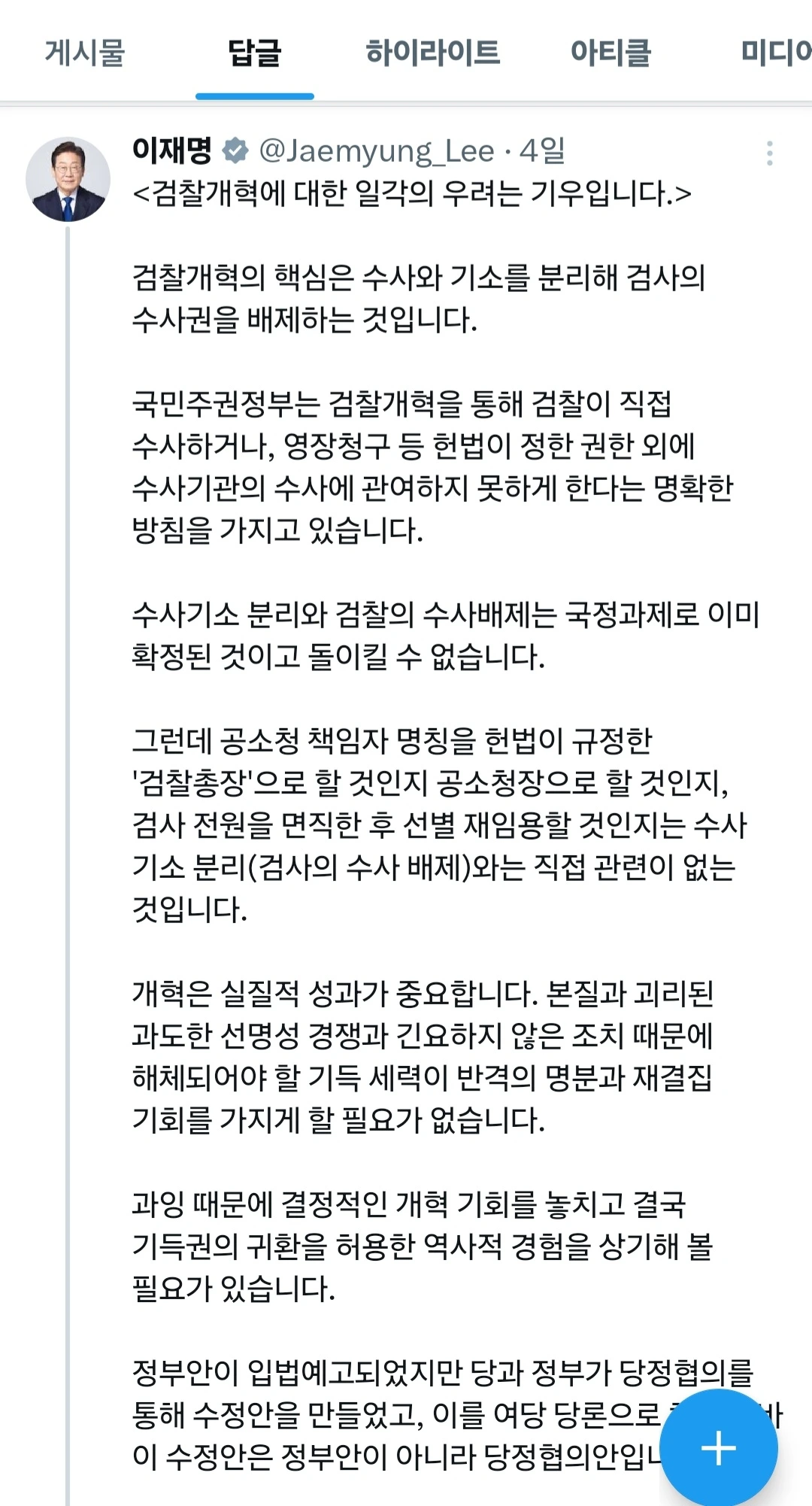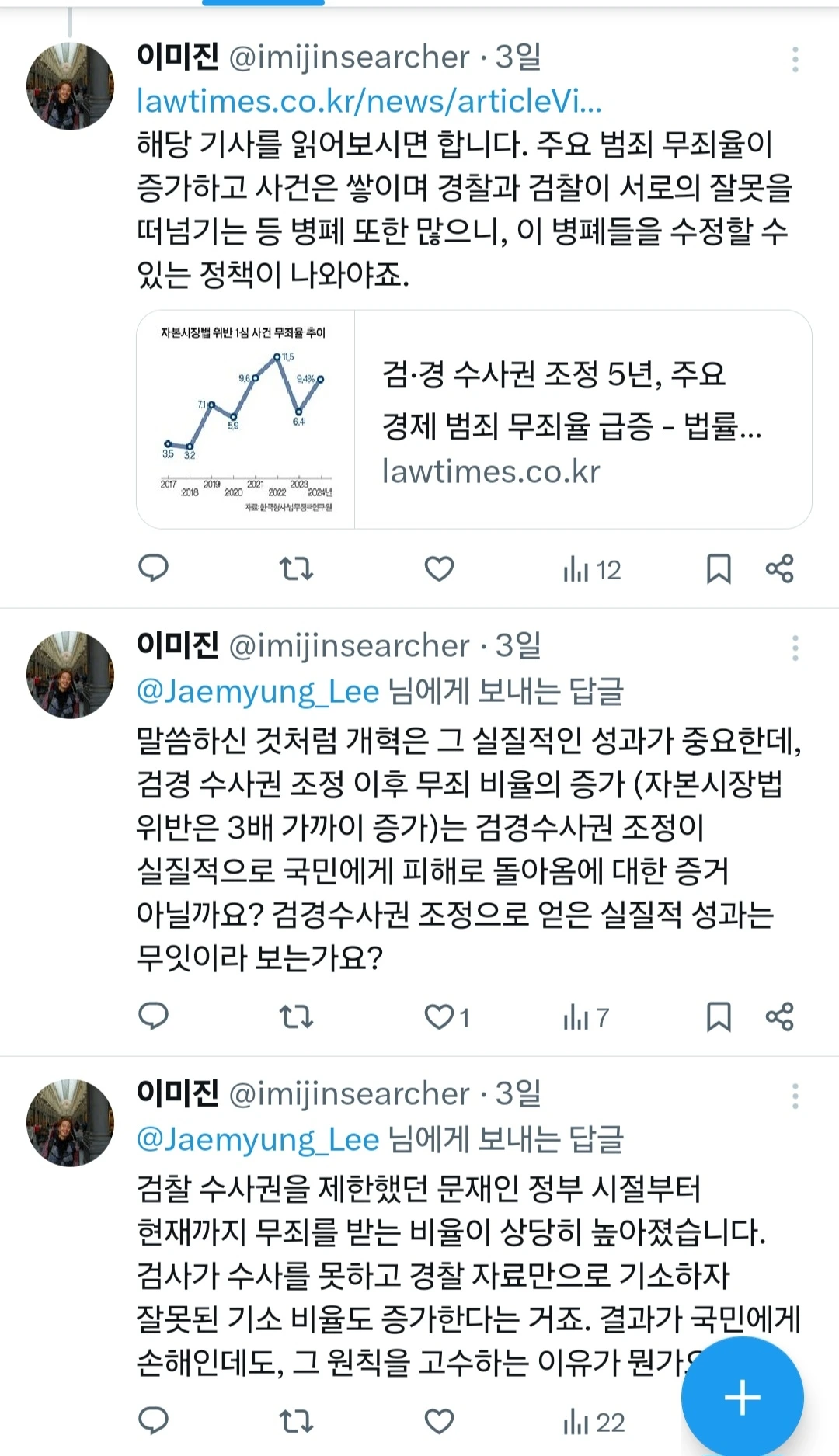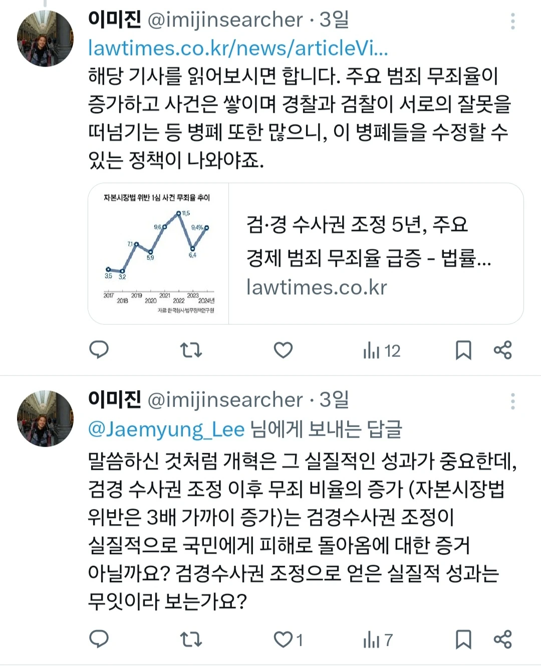 공소청 법이 통과되기 전, 부랴부랴 이재명 대통령 트위터에 검경수사권 조정 이후 무죄율이 높아지는 등 검찰 기소가 잘못되고 있다는 기사를 트윗했습니다만, 이재면 대통령과 민주당의 독주는 멈출 생각이 없네요.