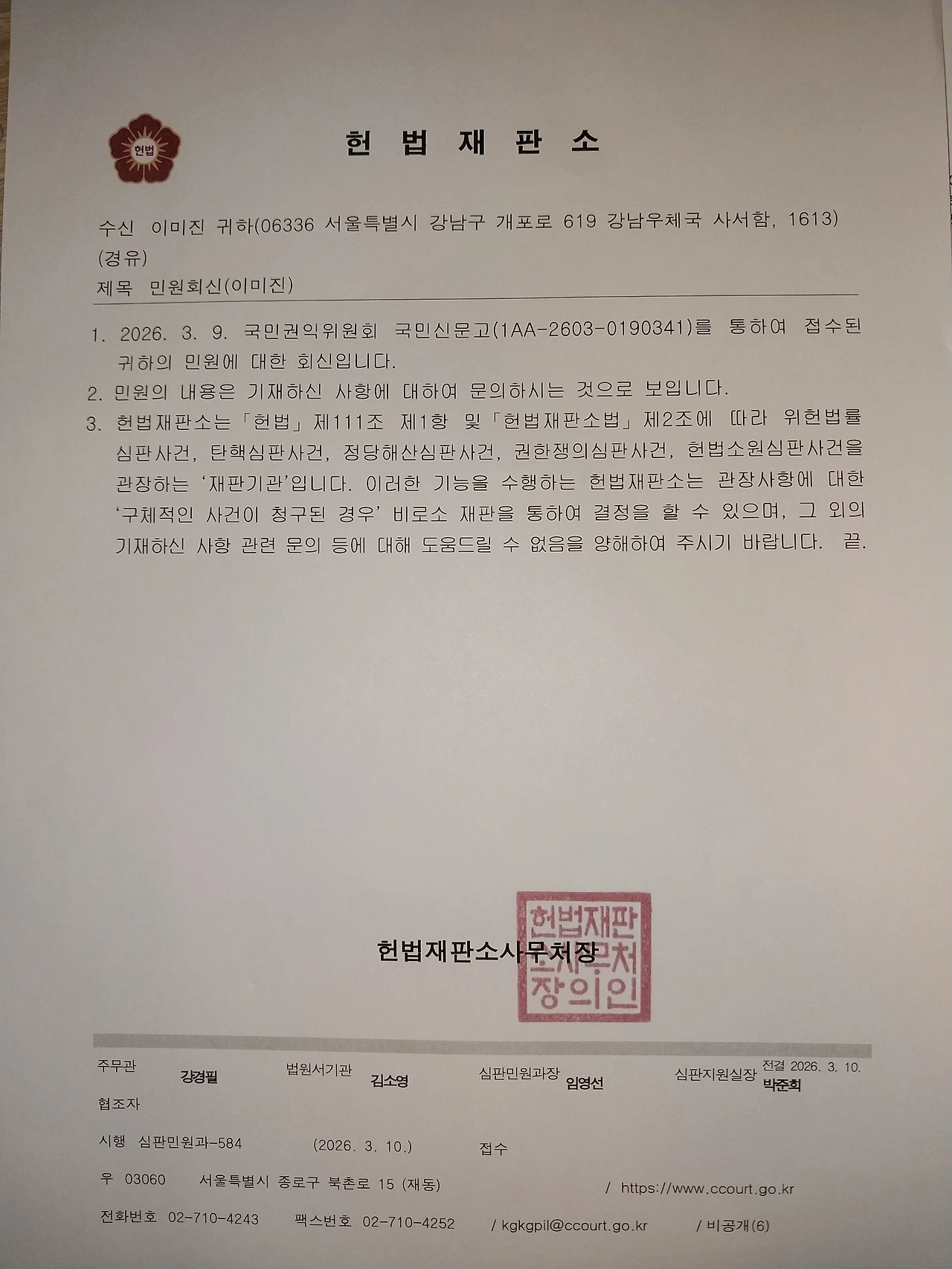 법왜곡죄 관련, 경찰이나 검사나 판사가 증거를 조작해 사건에 영향을 미친 사례가 있을까 생각이 들어, 헌법재판소에 문의를 하니, 헌법재판소는 헌법 재판 기관 업무만 수행한다고 하네요. 그렇다면 이런 사례는 없거나 조사 자체를 안 해왔다고 봐야겠죠. 법을 만들기 전에 사례가 얼마나 빈번한가 정도는 상식적으로 조사하는 게 맞는 거 같은데 말이죠.