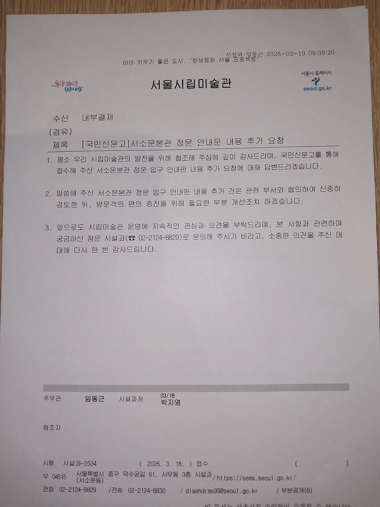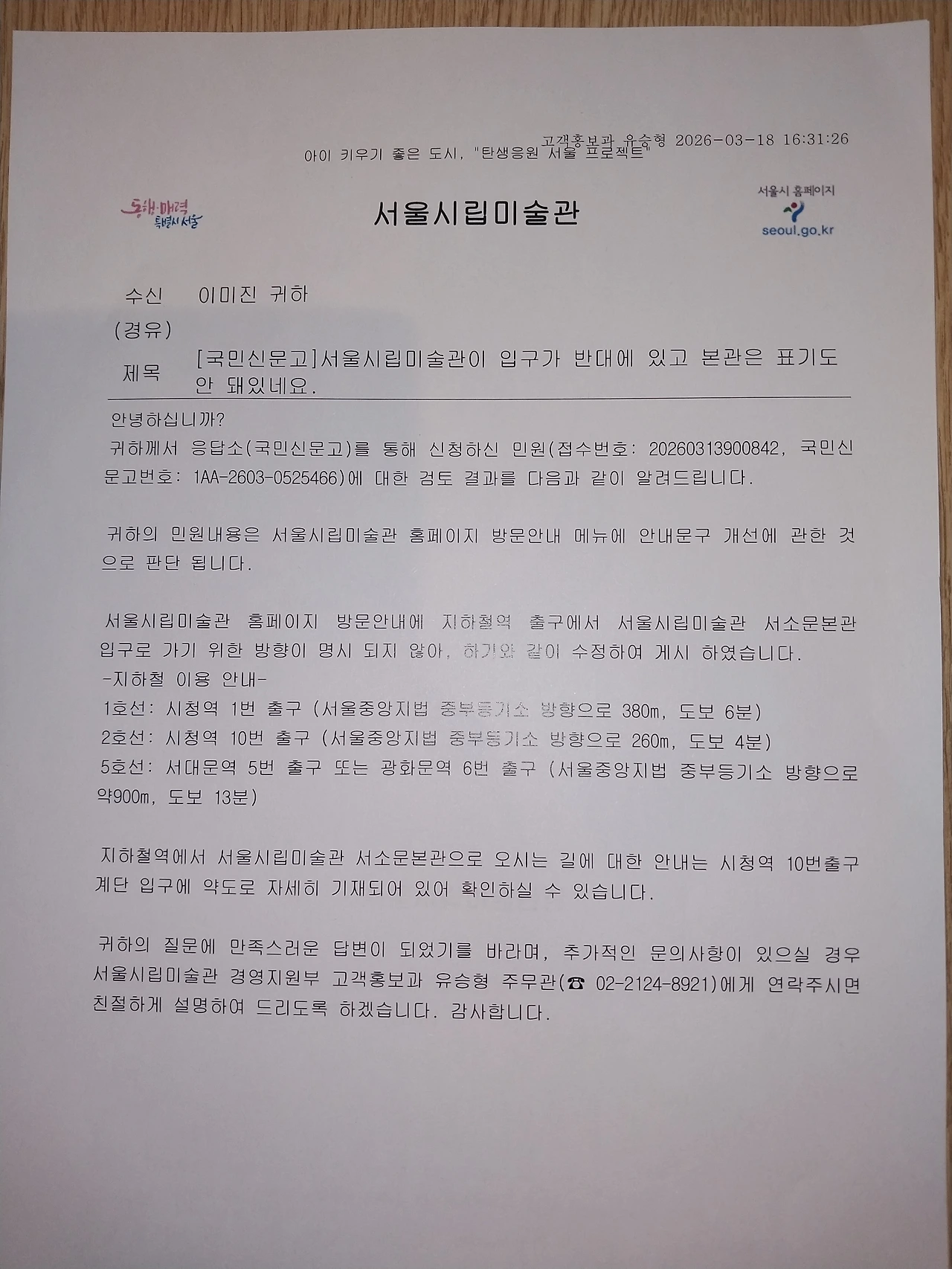 지하철 안내를 10번 출구로 나올 경우 골목에서 돌아야 한다는 것과 본관 건물을 본관으로 표기해달라 민원을 넣으니, 서울시립미술관에서 그렇게 했다고, 감사하게도 답변을 준 내용 올립니다.