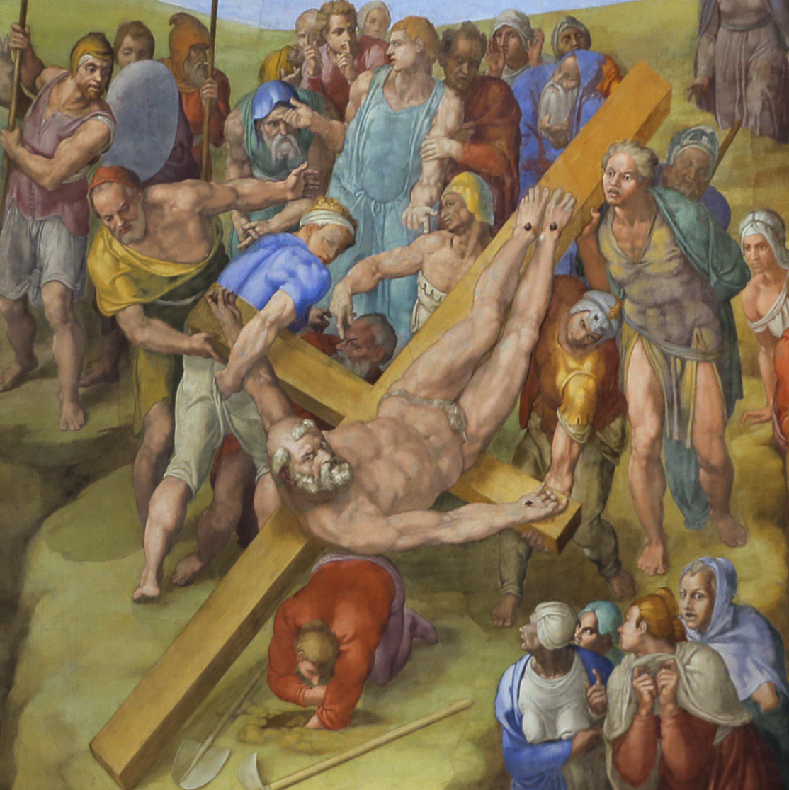 십자가에 거꾸로 매달린 베드로가 뒤틀린 몸으로 관람객을 노려보고 있다.