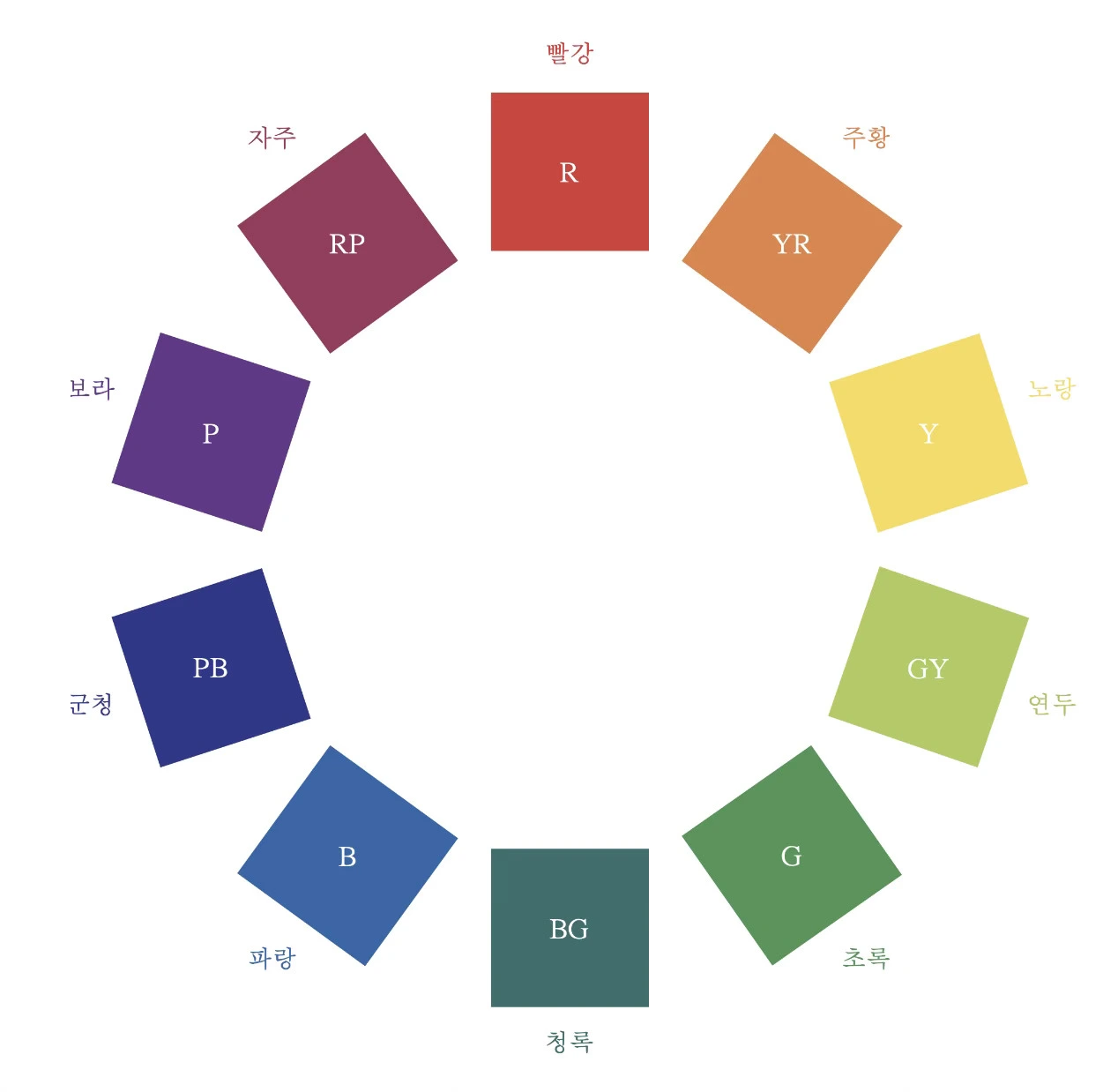이런 색상을 10가지로 나눈 '먼셀 (Albert H. Munsell)의 10 색상환'이 있습니다. 열개의 색으로 제시한 원처럼 배열해서 만든 것으로 색상환 (Hue Circle)이라고 합니다.