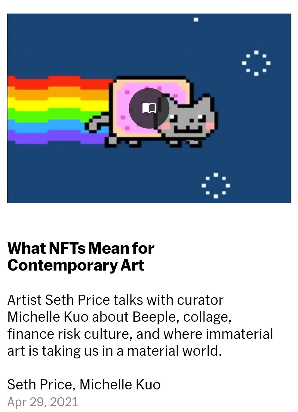 작가.세스 프라이스는-moma 웹페이지를 통해 “NFT의 본질은 아무도 도대체 무슨 일이 일어나고 있는지 이해하지 못한다는 것입니다”라는 인상적인 말을 남겼다.