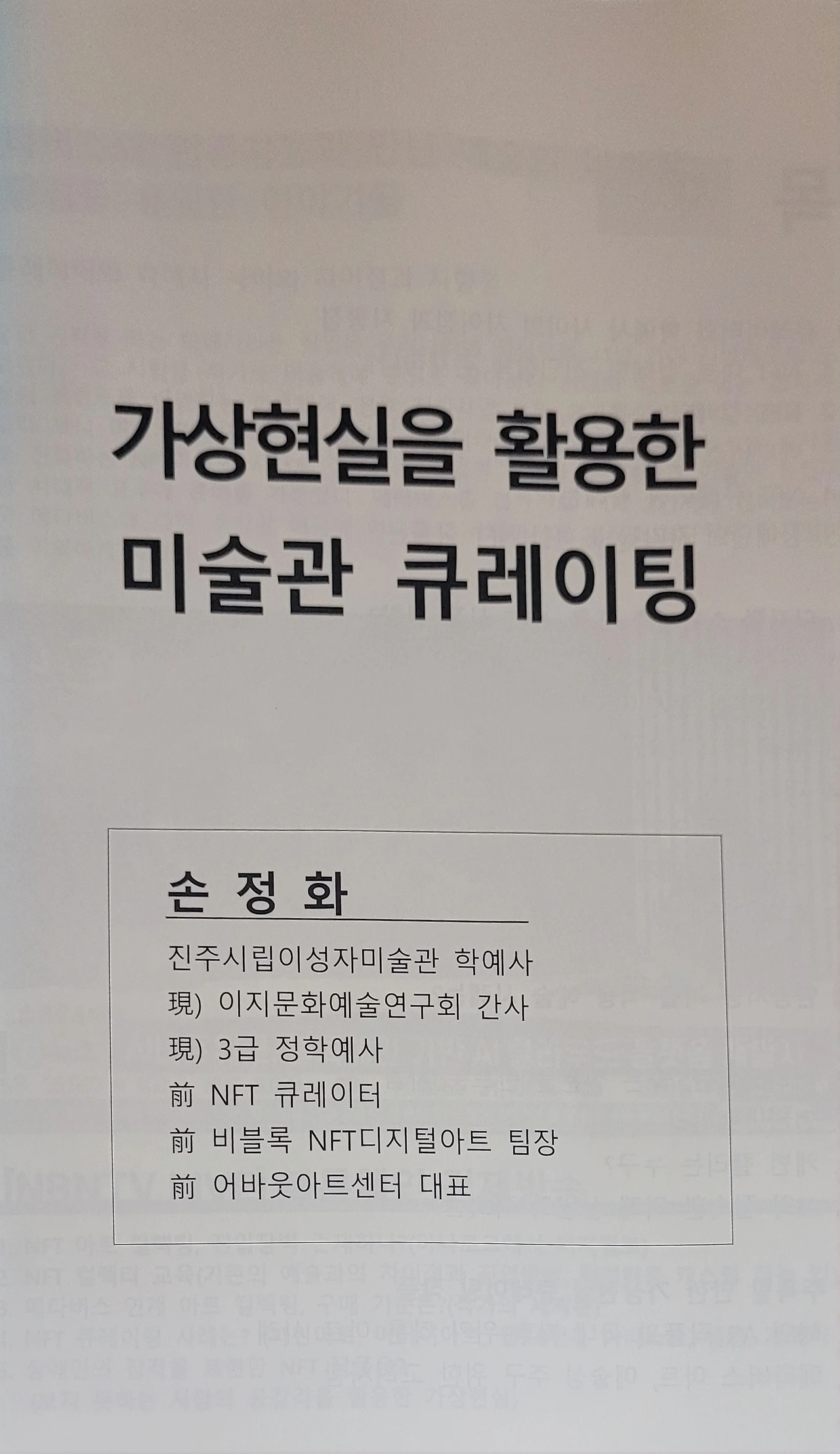https://linktr.ee/soncurator 학예사<기획, 법학전문지 등 기고. NBN경제TV생방출연.경희대,삼육대,경기대,전북대 특강. 홍대 문화예술경영학 박사과정