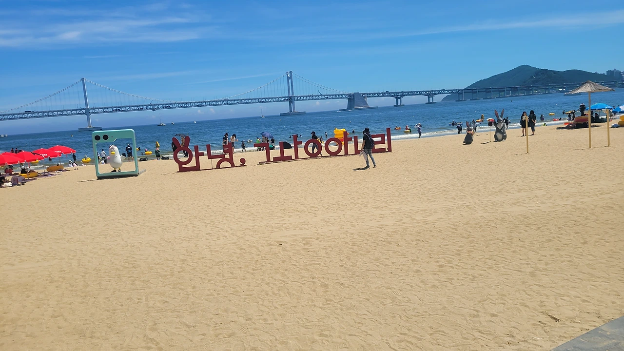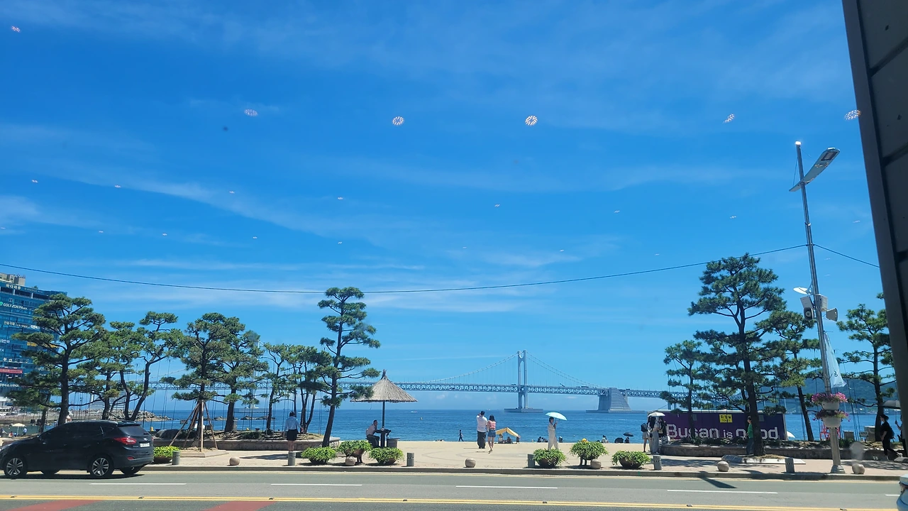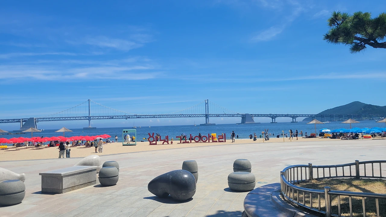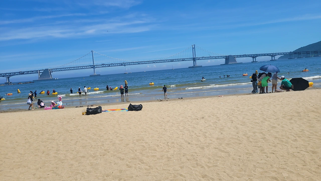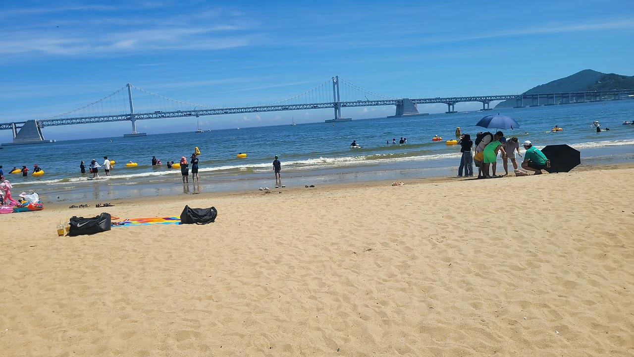 그러나, 출장중 잠시 들러본 광안리는 너무 눈부셨다. 1분인가 발을 담가 보았다.광안리는 여름철 가볼만한 곳이 아니라고한다 뜨거운 뙤약볕, 하루에 몇명이 더워서 돌아가시는 뉴스를 접하는 요즘에 광안리 휴가가 맘 편하지도 몸도 뜨겁고, 권장할 수 없는 햇살 아래였다. 잠시나마 발바닥을 모래에 부딪혀보니 온도는 적당하였다. 그래도 몸을 담글 만큼은 좋은 해는 아니다.