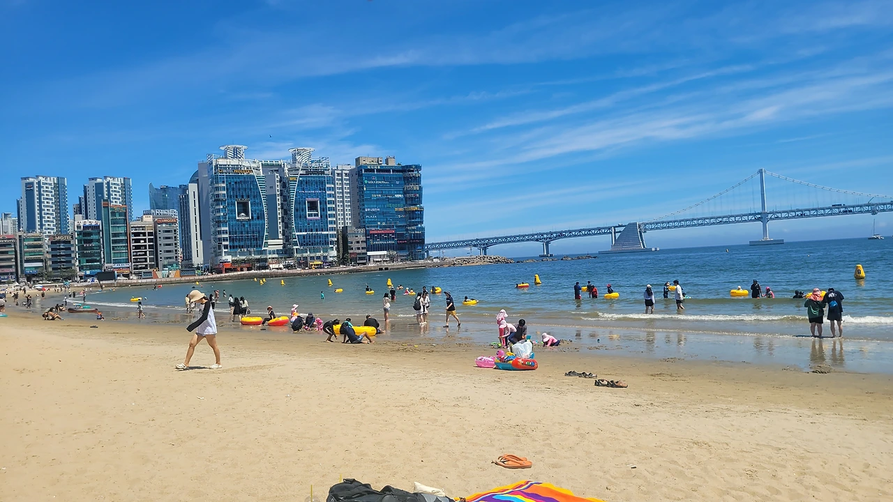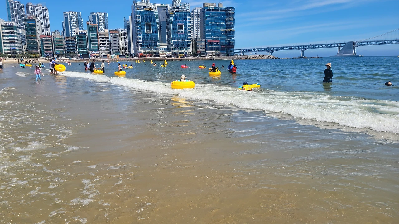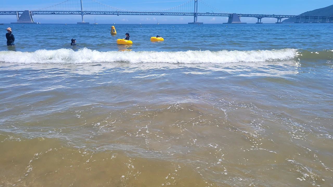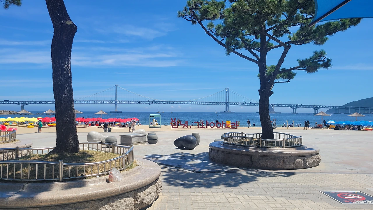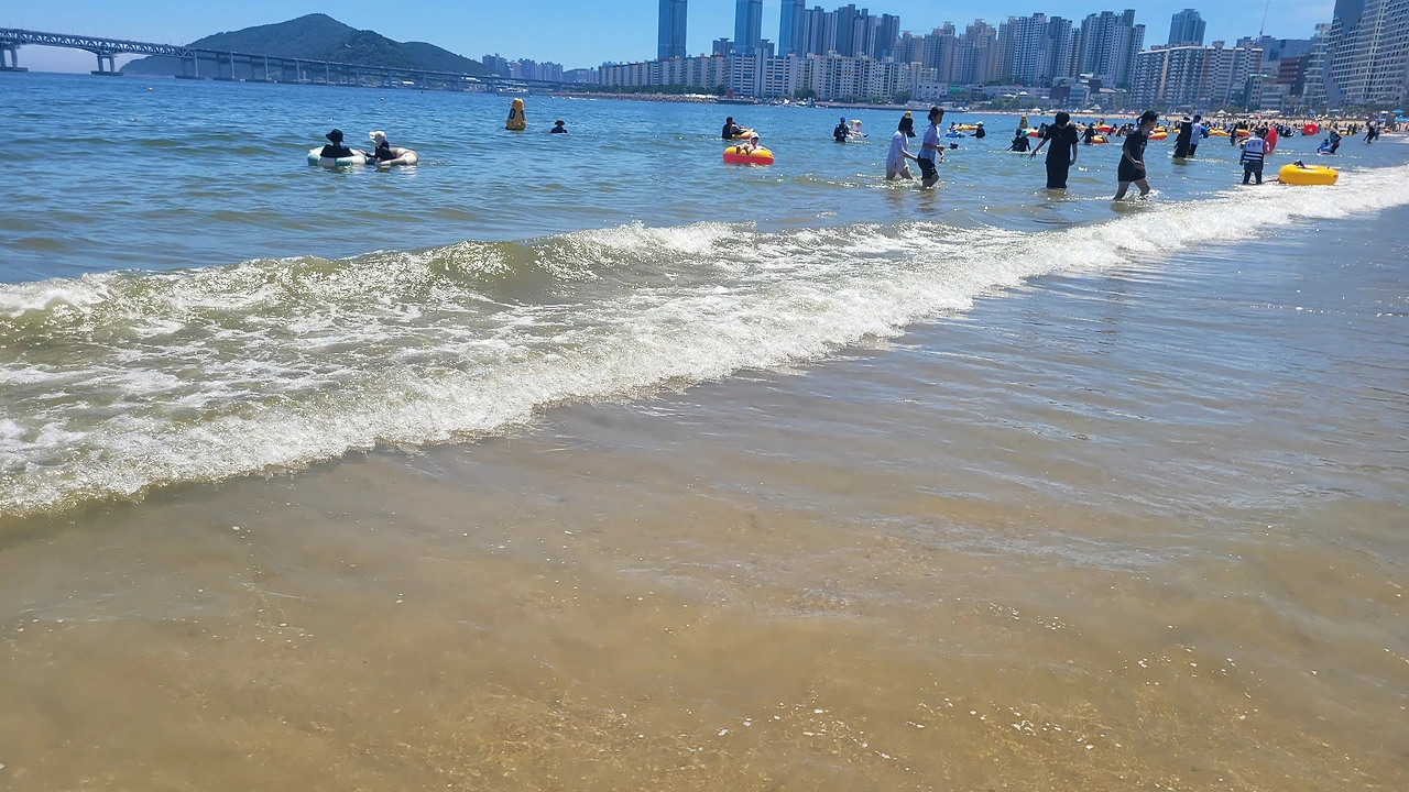 그러나, 출장중 잠시 들러본 광안리는 너무 눈부셨다. 1분인가 발을 담가 보았다.광안리는 여름철 가볼만한 곳이 아니라고한다 뜨거운 뙤약볕, 하루에 몇명이 더워서 돌아가시는 뉴스를 접하는 요즘에 광안리 휴가가 맘 편하지도 몸도 뜨겁고, 권장할 수 없는 햇살 아래였다. 잠시나마 발바닥을 모래에 부딪혀보니 온도는 적당하였다. 그래도 몸을 담글 만큼은 좋은 해는 아니다.