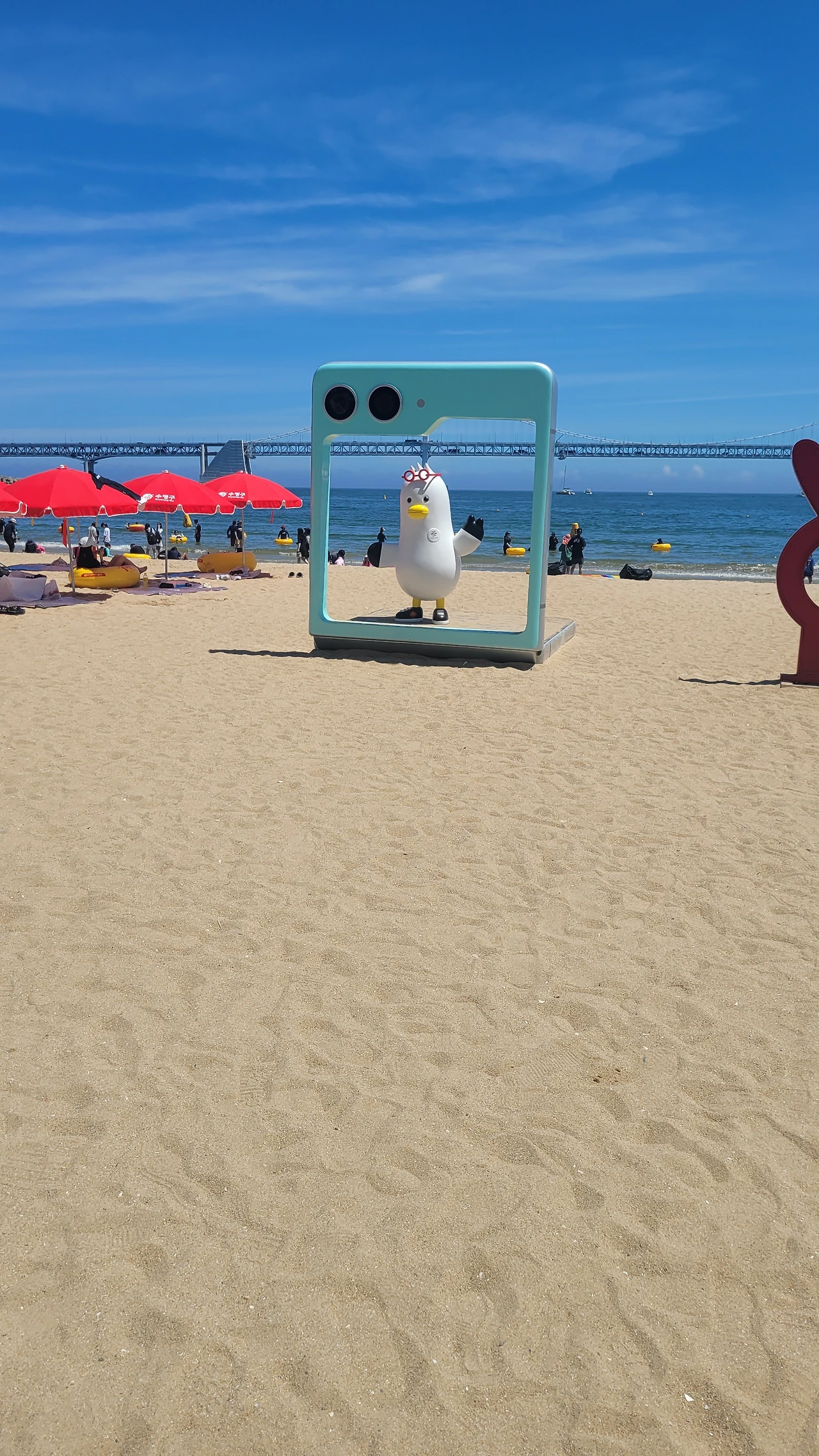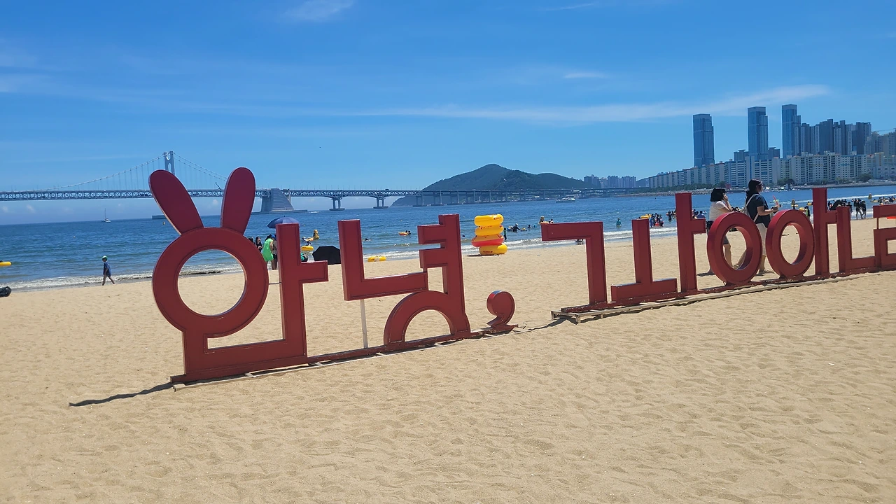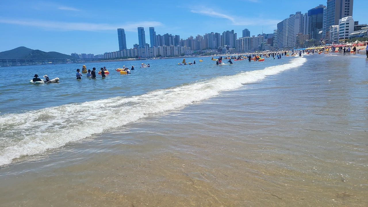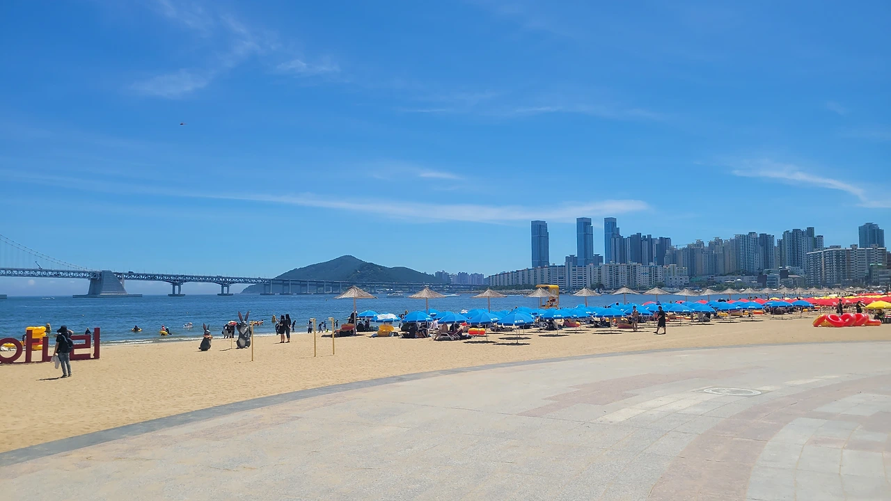그러나, 출장중 잠시 들러본 광안리는 너무 눈부셨다. 1분인가 발을 담가 보았다.광안리는 여름철 가볼만한 곳이 아니라고한다 뜨거운 뙤약볕, 하루에 몇명이 더워서 돌아가시는 뉴스를 접하는 요즘에 광안리 휴가가 맘 편하지도 몸도 뜨겁고, 권장할 수 없는 햇살 아래였다. 잠시나마 발바닥을 모래에 부딪혀보니 온도는 적당하였다. 그래도 몸을 담글 만큼은 좋은 해는 아니다.