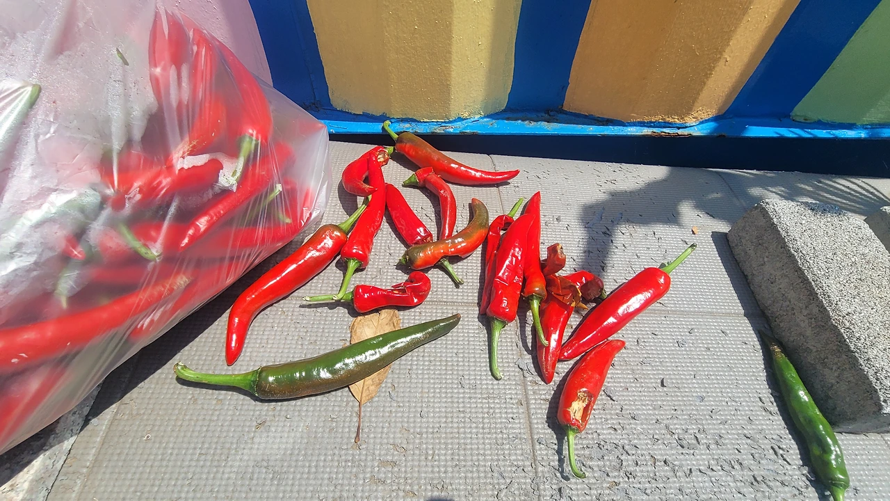 태양에 고추를 말리고 있는 풍경