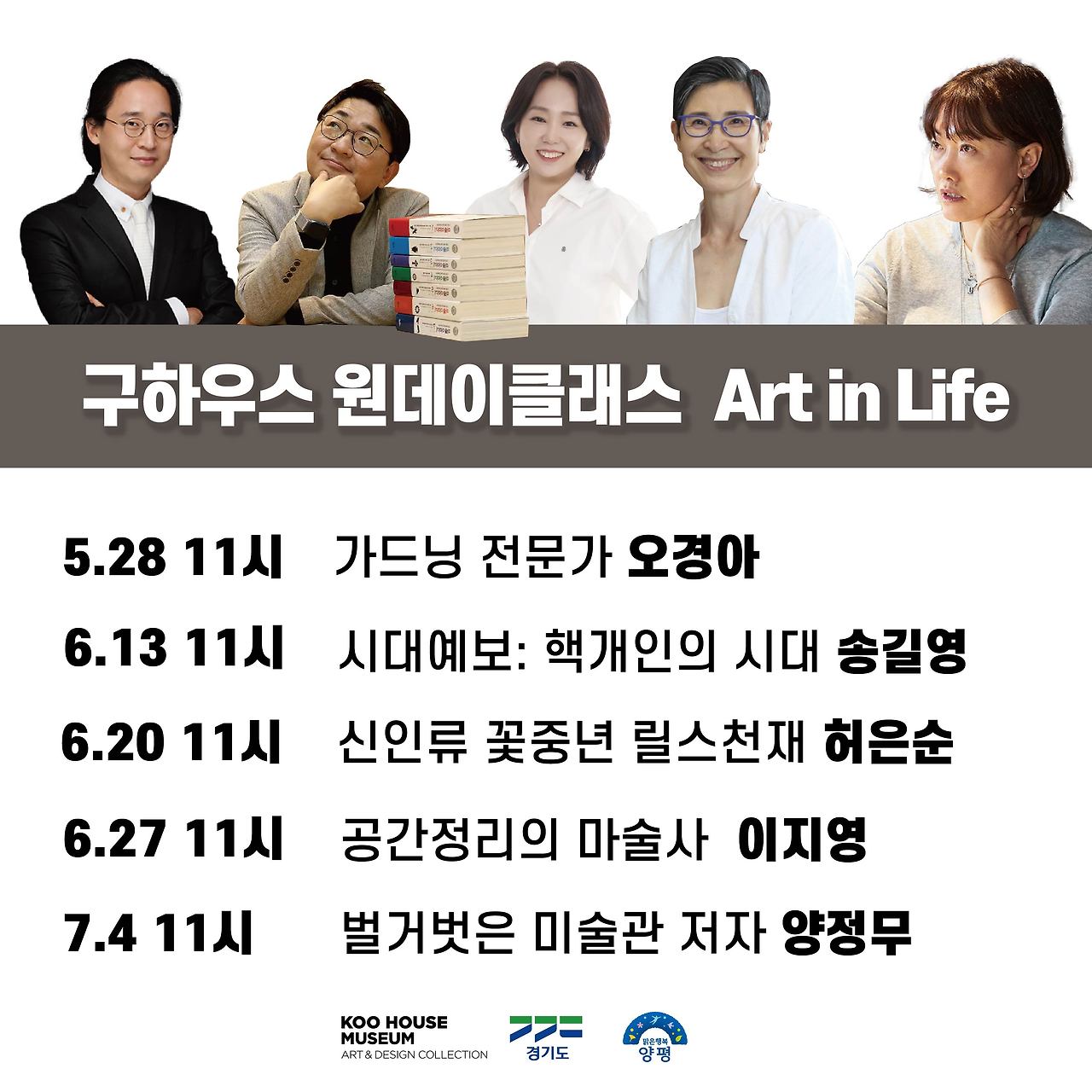 구하우스 아카데미에서는 다양한 전문가들을 초청하여 특별 강연 시리즈를 개최합니다. 가드닝 전문가 오경아부터 시작하여, 시대를 예보하는 송길영, 신인류 꽃중년 릴스천재 허은순너, 공간 정리의 마술사 이지영, 마지막으로 발칙한 미술관 저자 양정무까지, 각기 다른 분야의 전문가들이 그들의 지식과 경험을 공유할 예정입니다. 이 시리즈는 5월 28일부터 7월 4일까지 매주 오전 11시에 진행됩니다.