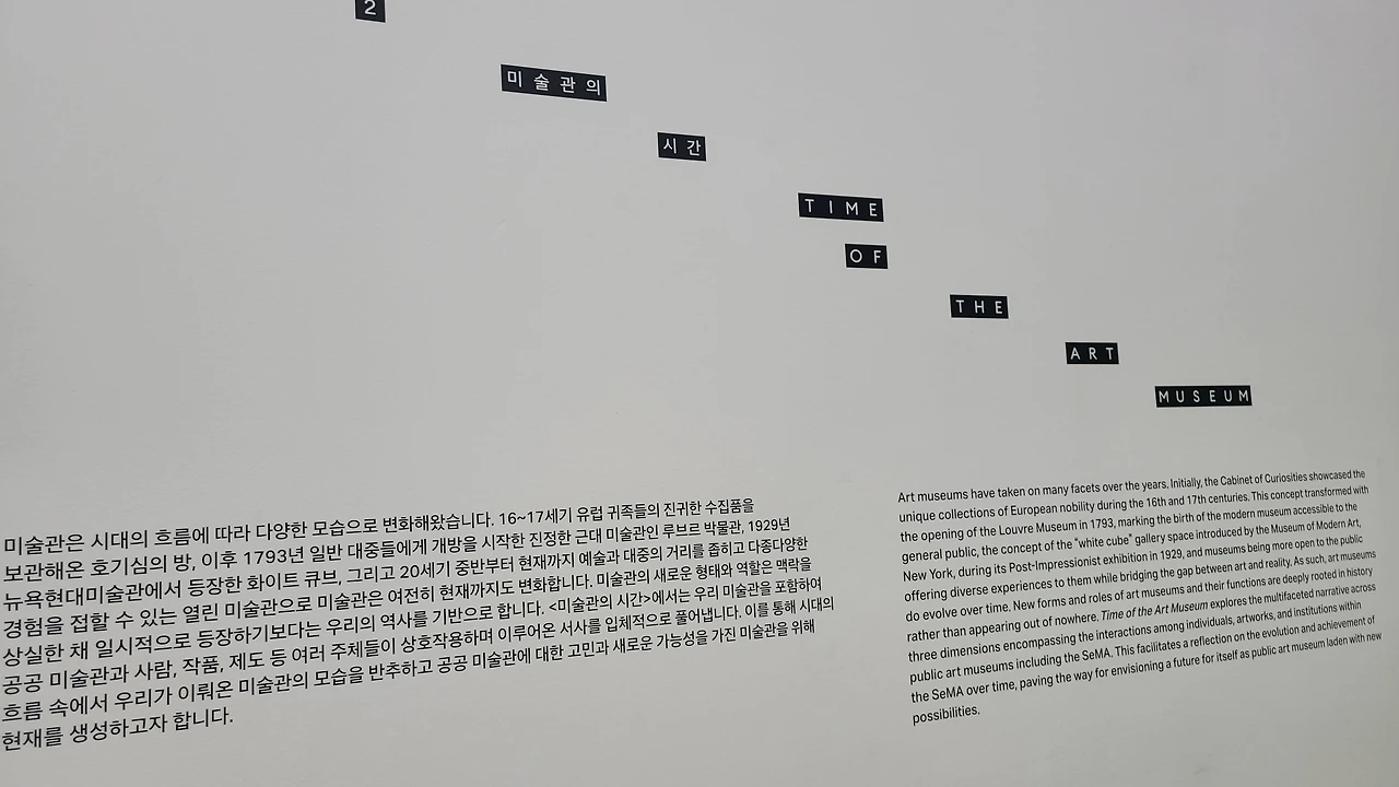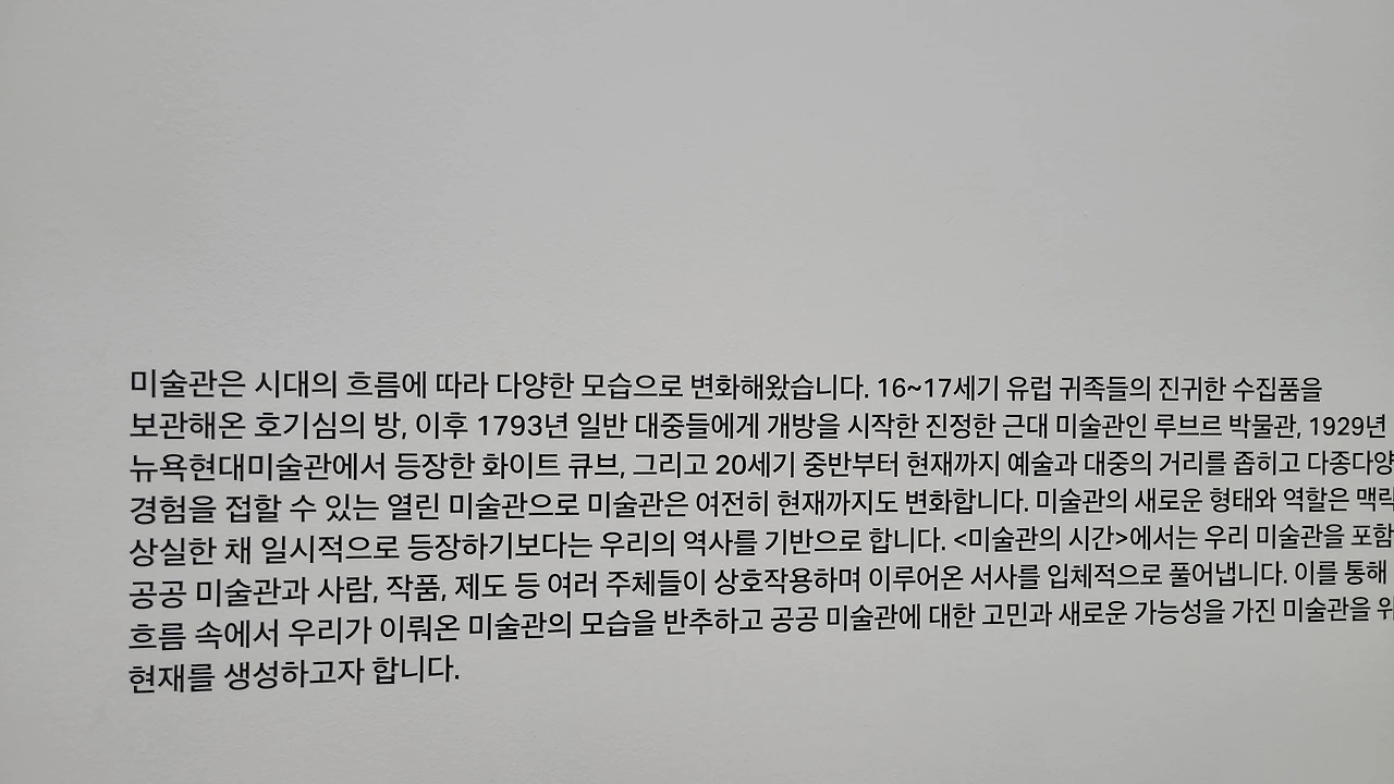 미술관이 16세기 유럽 귀족들의 호기심을 채우는 방으로 부터 시작해서, 1793년 루브르 박물관, 1929년 뉴욕현대미술관에서 등장한 화이트 큐브, 20세기 중반까지 대중과의 거리가 가까워져, 서울 시립에서 <미술관의 시간: 시공 시나리오>를 기획한 모습이다.