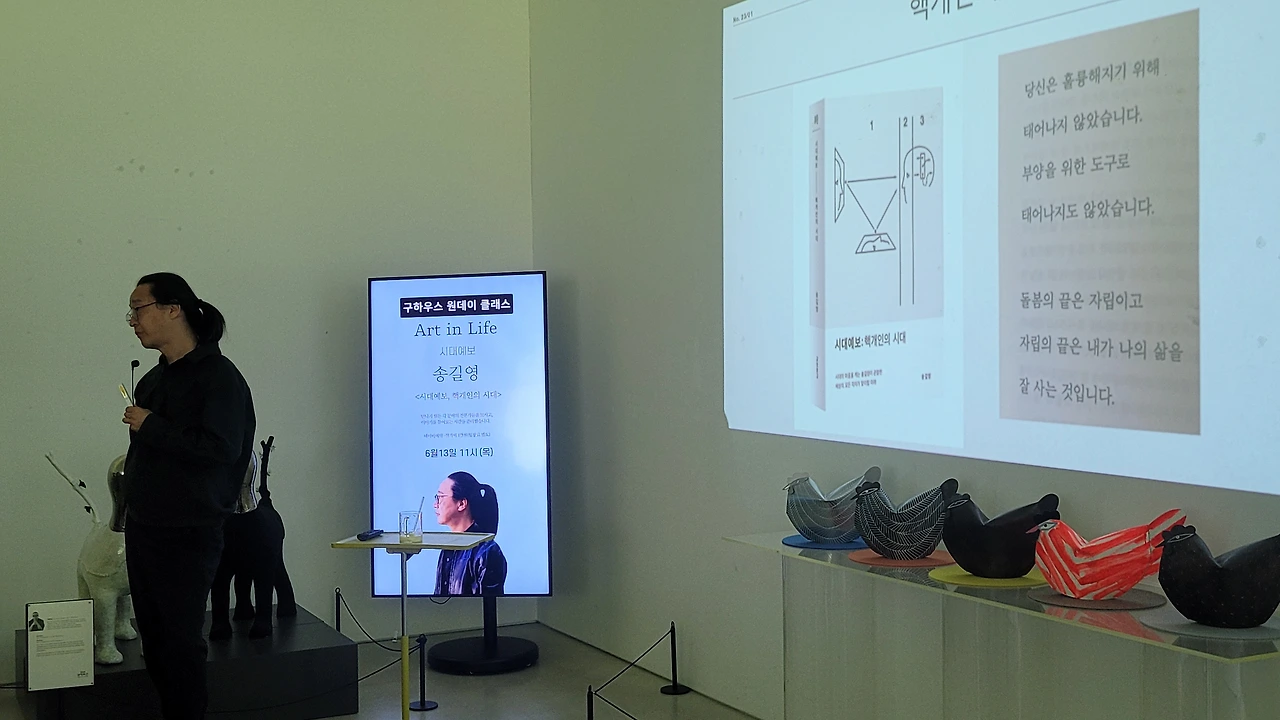 지난겨울 리움미술관 필립파레노 전시 때 만나서, 구하우스 원데이클래스 섭외가 되었는데, 오늘, 그 인연에 대해서 말씀해 주셨다. 어떤 이가 "성공하고 싶다"는 질문을 했는데! 종교 철학을 가지는 게 좋겠다는 이야기가 참으로 납득이 되었다.