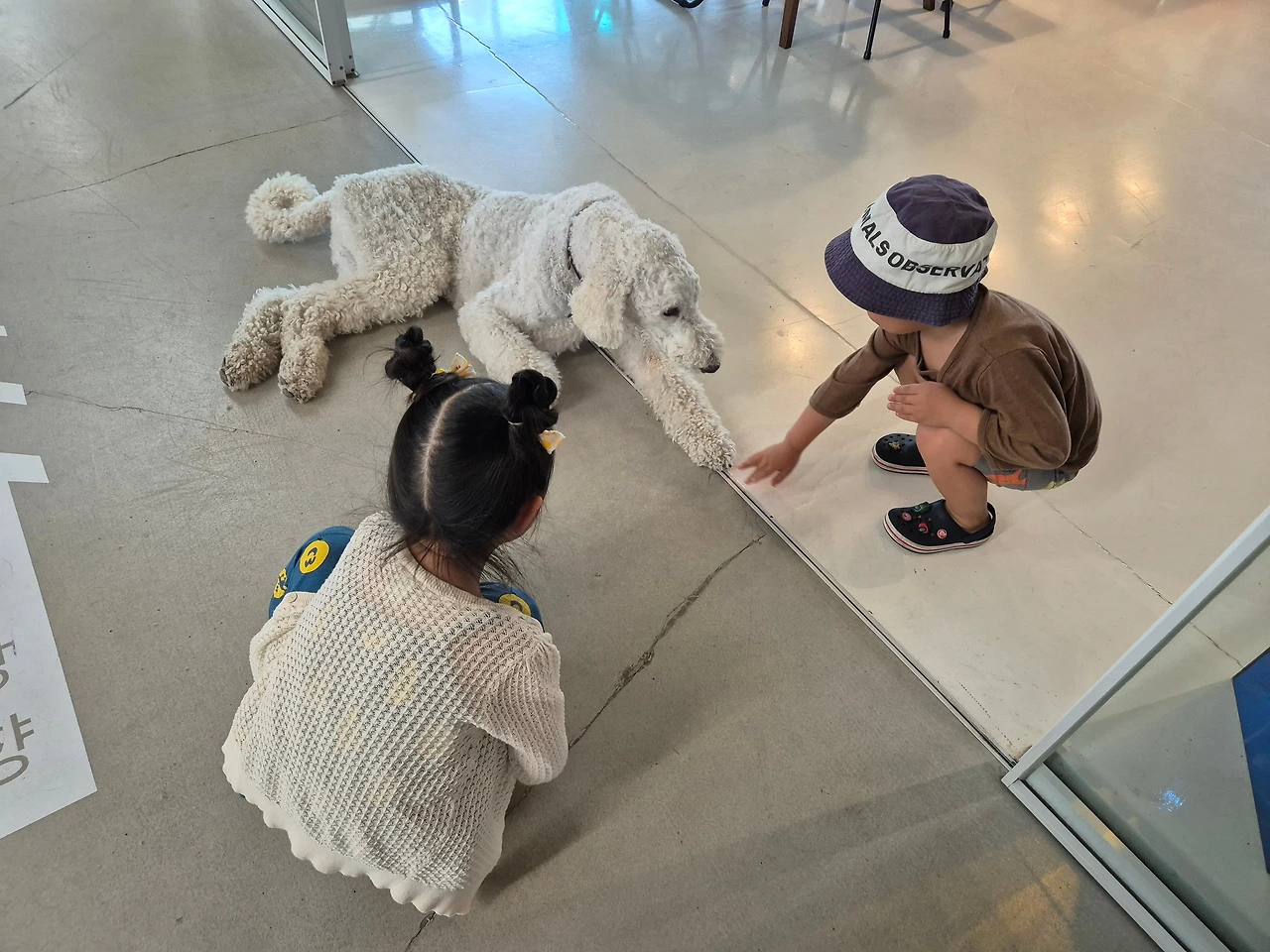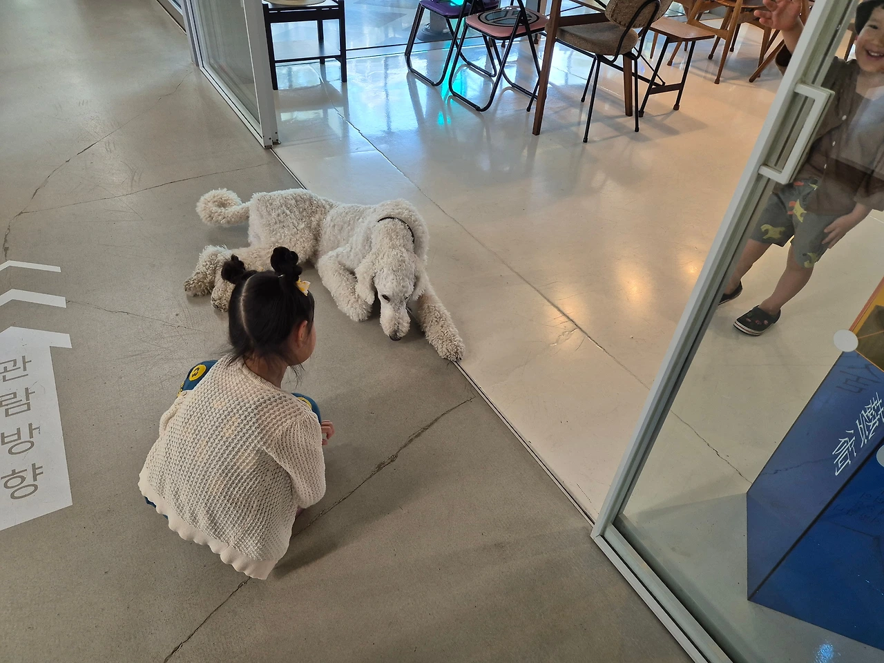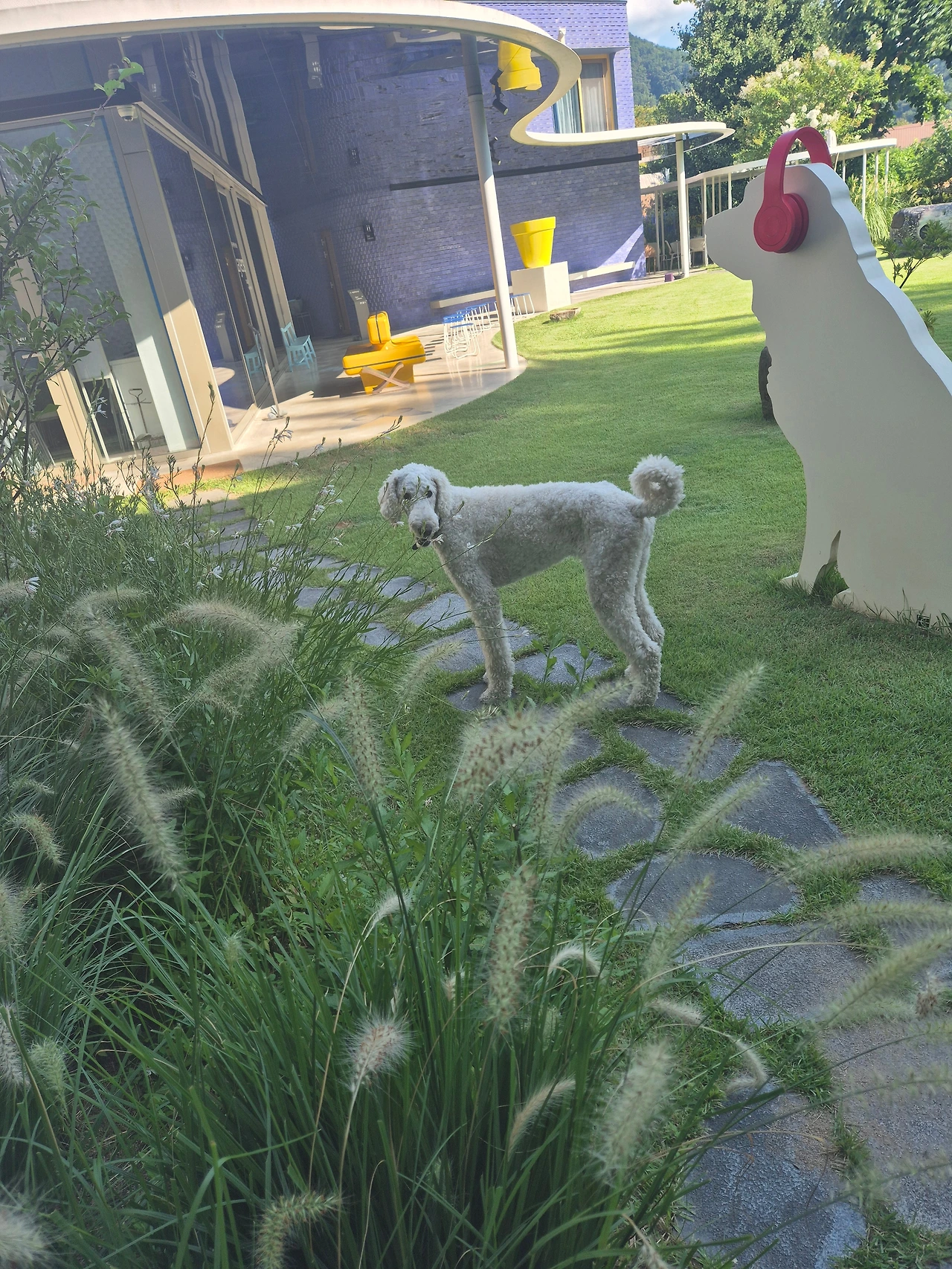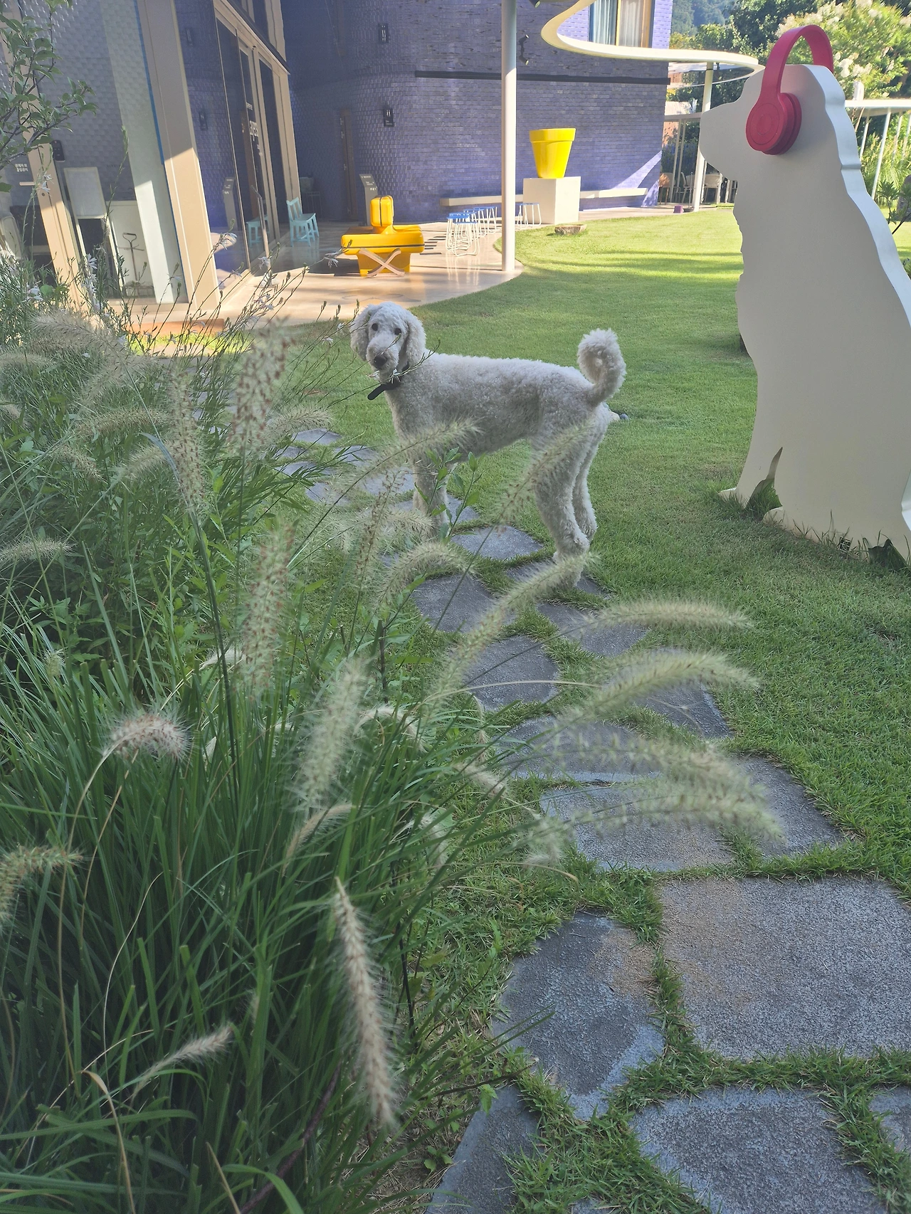 8.15 광복절에 이어 연신 관람객이 많다. 강남라인이라 잠실 등지에서 서울 인파들이 꽤 몰린다. 코로나 때도 평소보다 더 왔다는 이곳 #구하우스 미술관에 관람객이 끝도 없이 오네! 휴일이고, 관광지니까 가평에 양평에 북한강에 펜션에~ 펜캉스~뮤캉스 하러 오는 관람객들이 더 부쩍 늘었다. 미술관 강아지는 연신 사람들 사랑을 받고 공놀이의 즐거움에 사람의 생보다는 좀 더 엔조이 풀하게 여름을 잘 나고 있다. 강아지와 교감하는 아기들 뒷모습이 너무 꼬물꼬물 귀여워서 한컷!, 똥강아지 공놀이 해달라고 물끄러미 보고 있어서 강아지풀과 강아지와 강아지 조각 속에서 한컷!