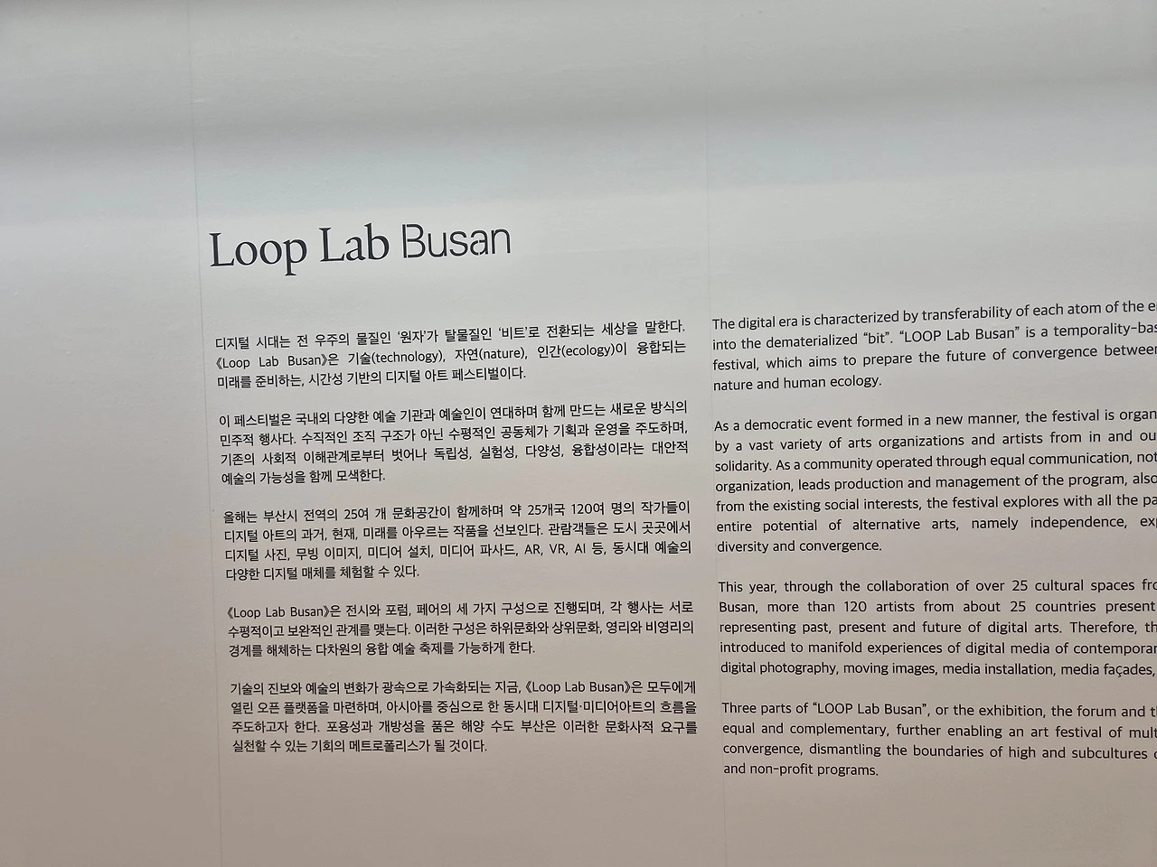부산 전역 26개 문화 공간에서 동시다발적으로 펼쳐진 ‘루프 랩 부산’은 예술과 기술, 도시와 삶을 연결하는 하나의 거대한 실험장이었다. 스페인 ‘루프 바르셀로나’와 부산시립미술관, 문화기획사 에이플럭션의 협업으로 성사된 이번 프로젝트는 단순한 전시가 아니라 전 세계 미디어 아트의 흐름이 도시에 스며드는 방식이자, 미술관이라는 경계를 넘어선 예술 실천의 현장이었다.