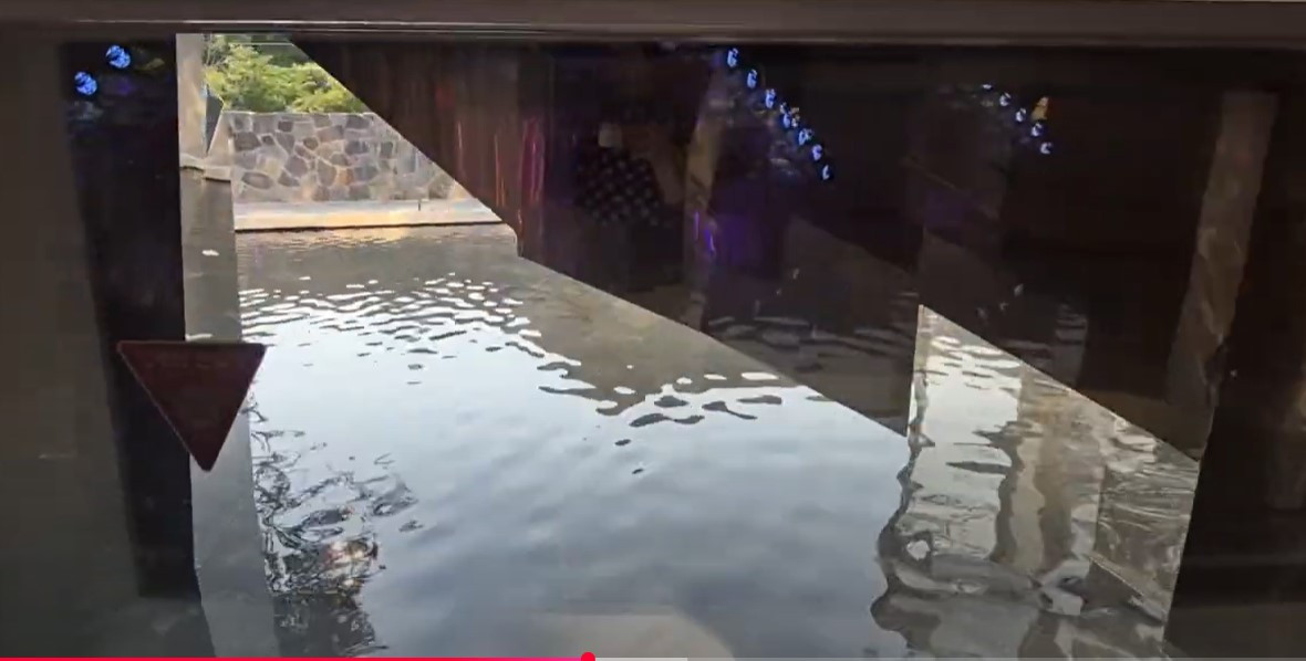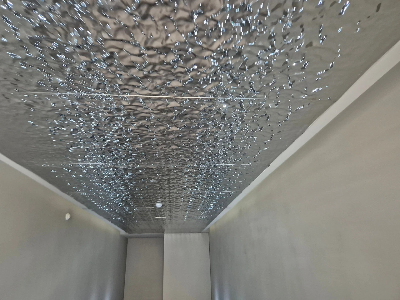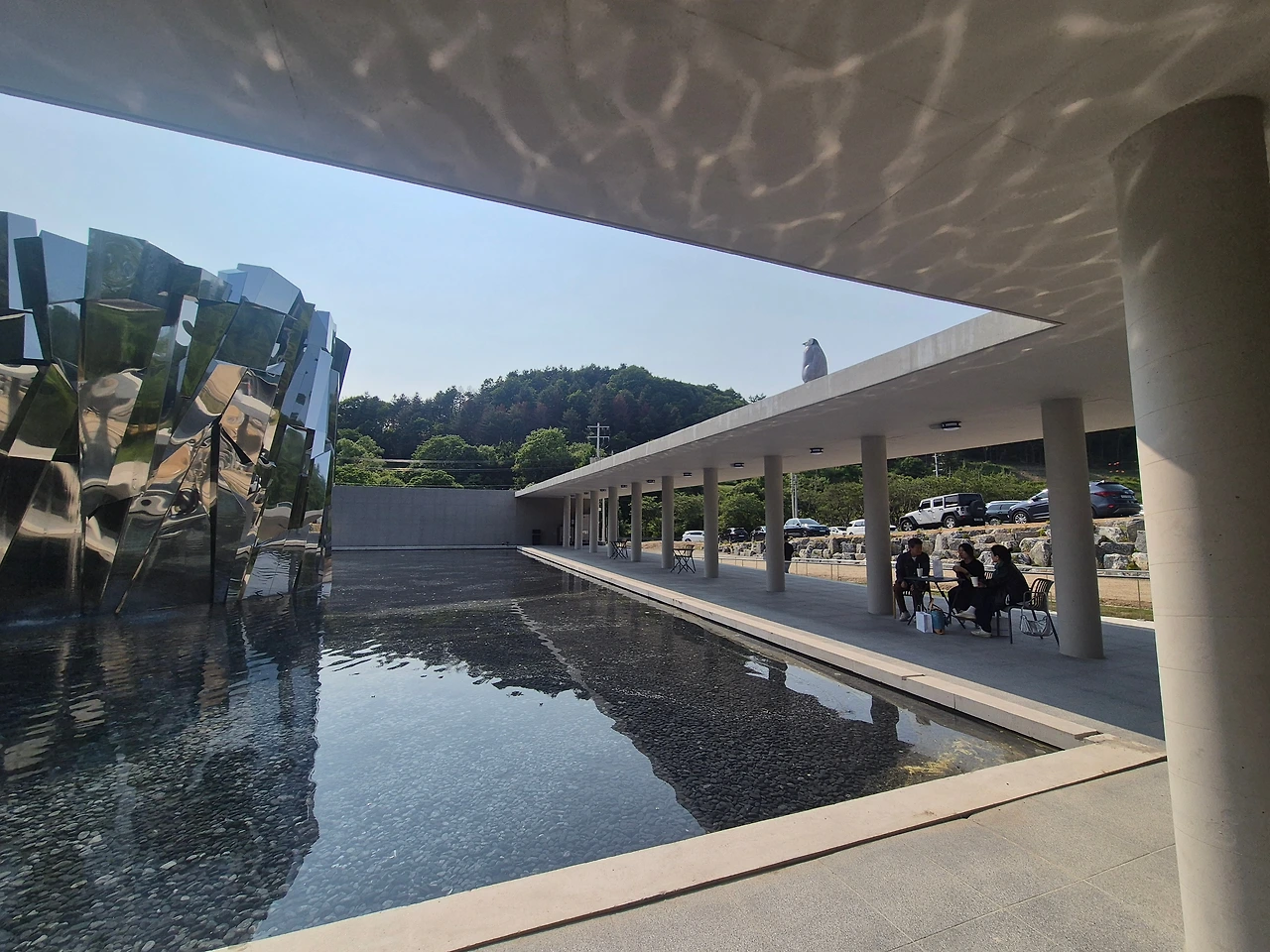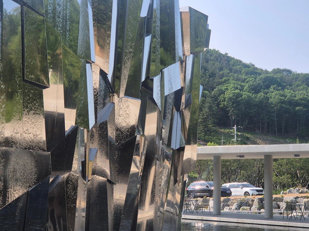 물방울은 또렷한 동심원을 만들고, 물의 움직임과 금속의 반사면은 마치 거울처럼 하늘을 되비춘다.