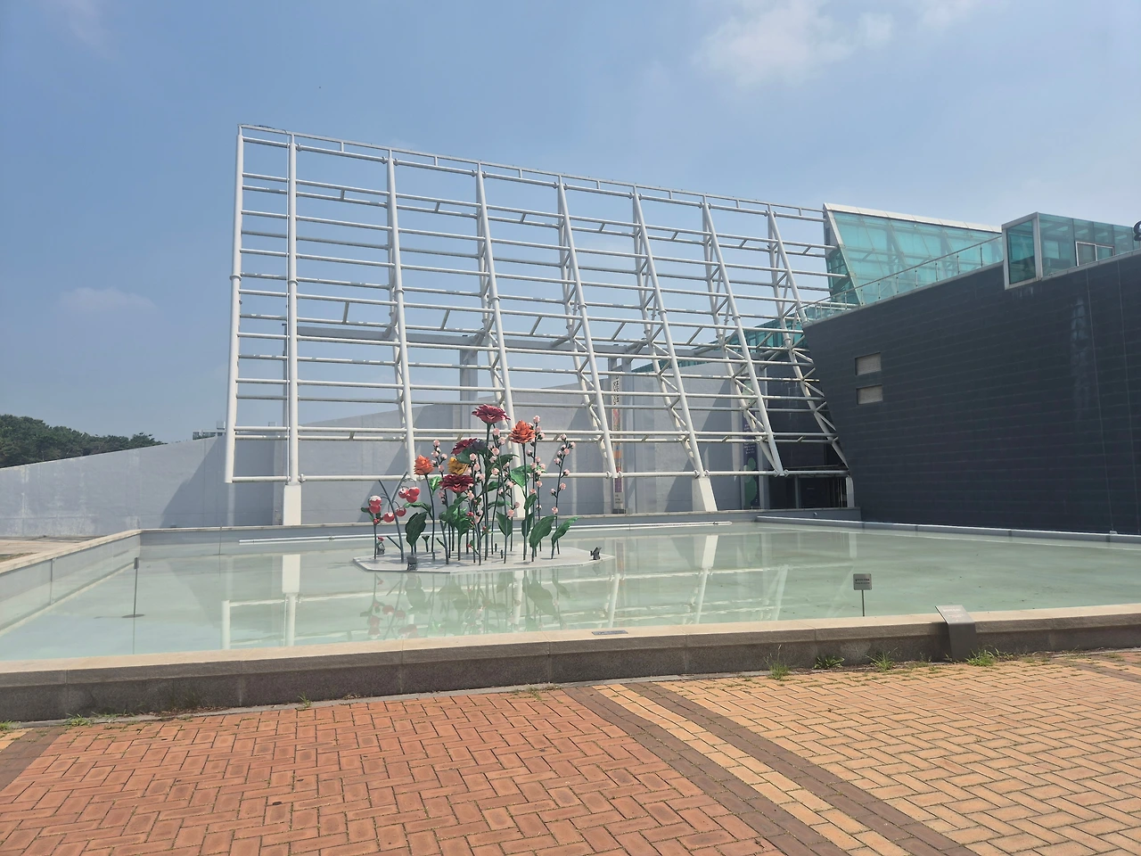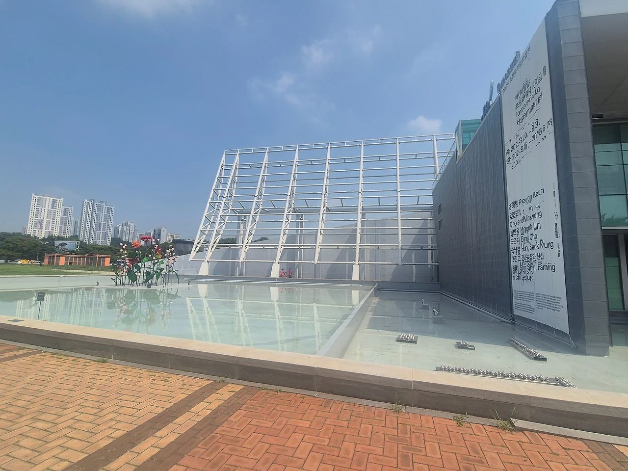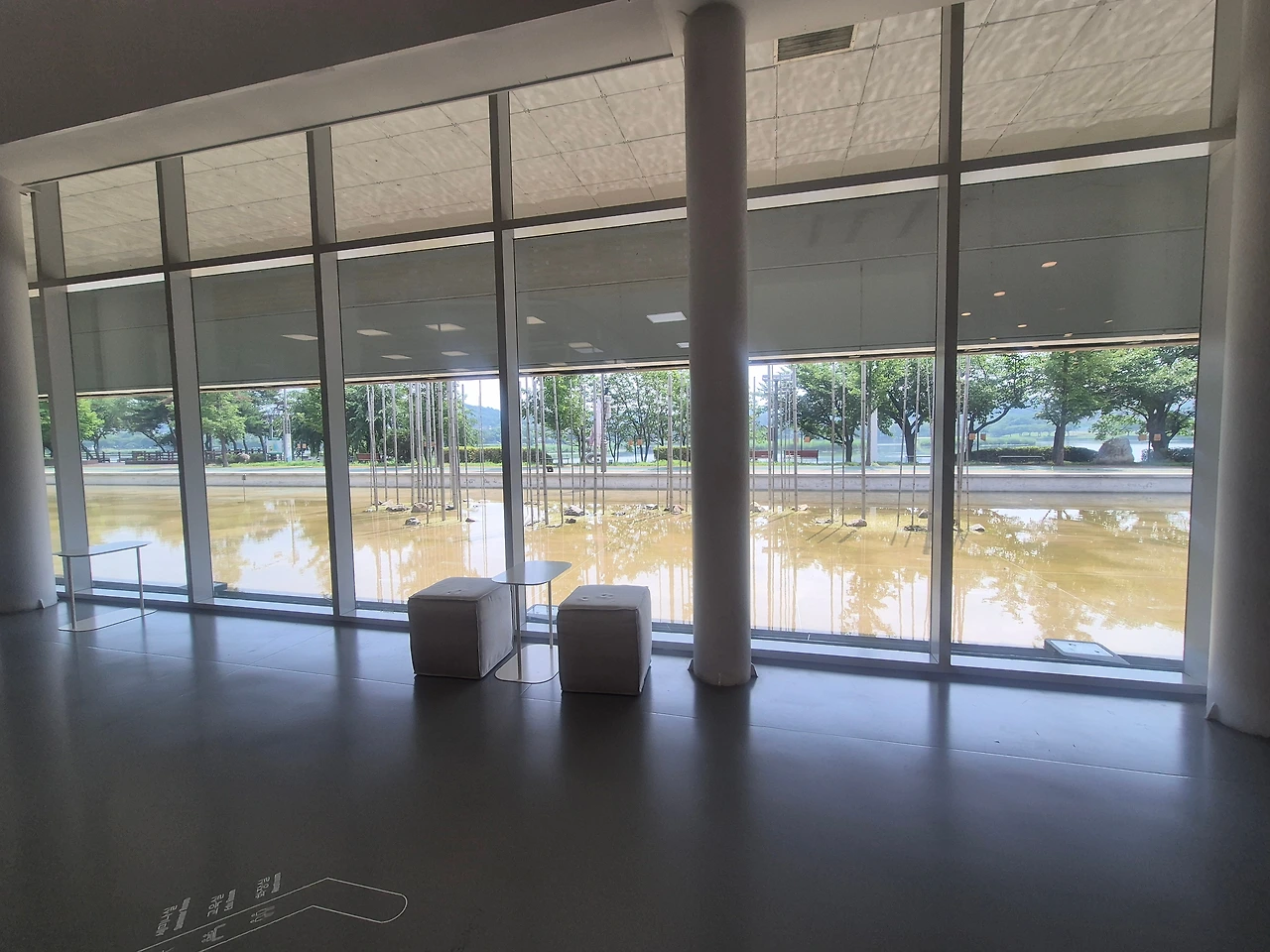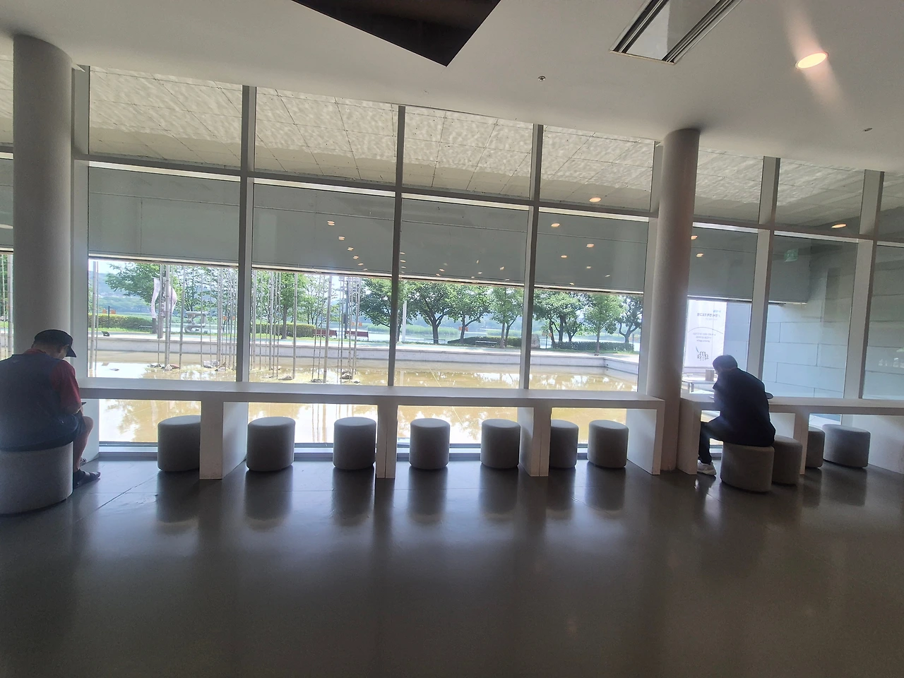 그때가 경기도립 초기 개관때 였으니까 벌써 20년 지났지만 이 미술관은 지금도 디자인이 낙후되어보이진 않는다. 3만평 산마루 공원에 비해, 10배까지는 아니고 20만평 유원지 속에, 2천평의 연면적으로 2층으로 지어진 미술관~! 지하는 없고 수장고가 반지하로 형성되어있다~. 연면적의 10프로~15프로 비율을 차지하는 수장고~