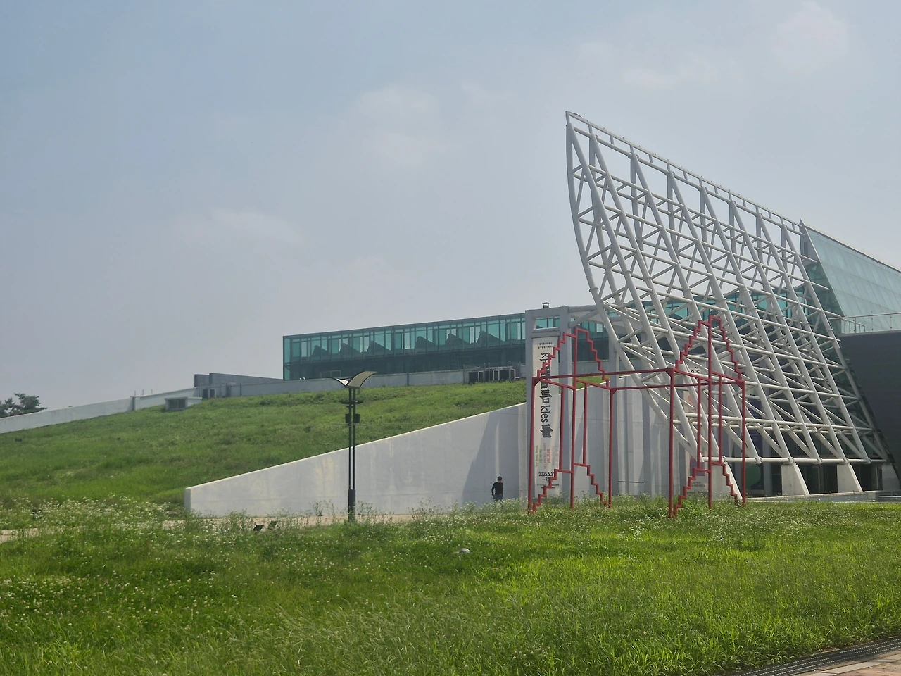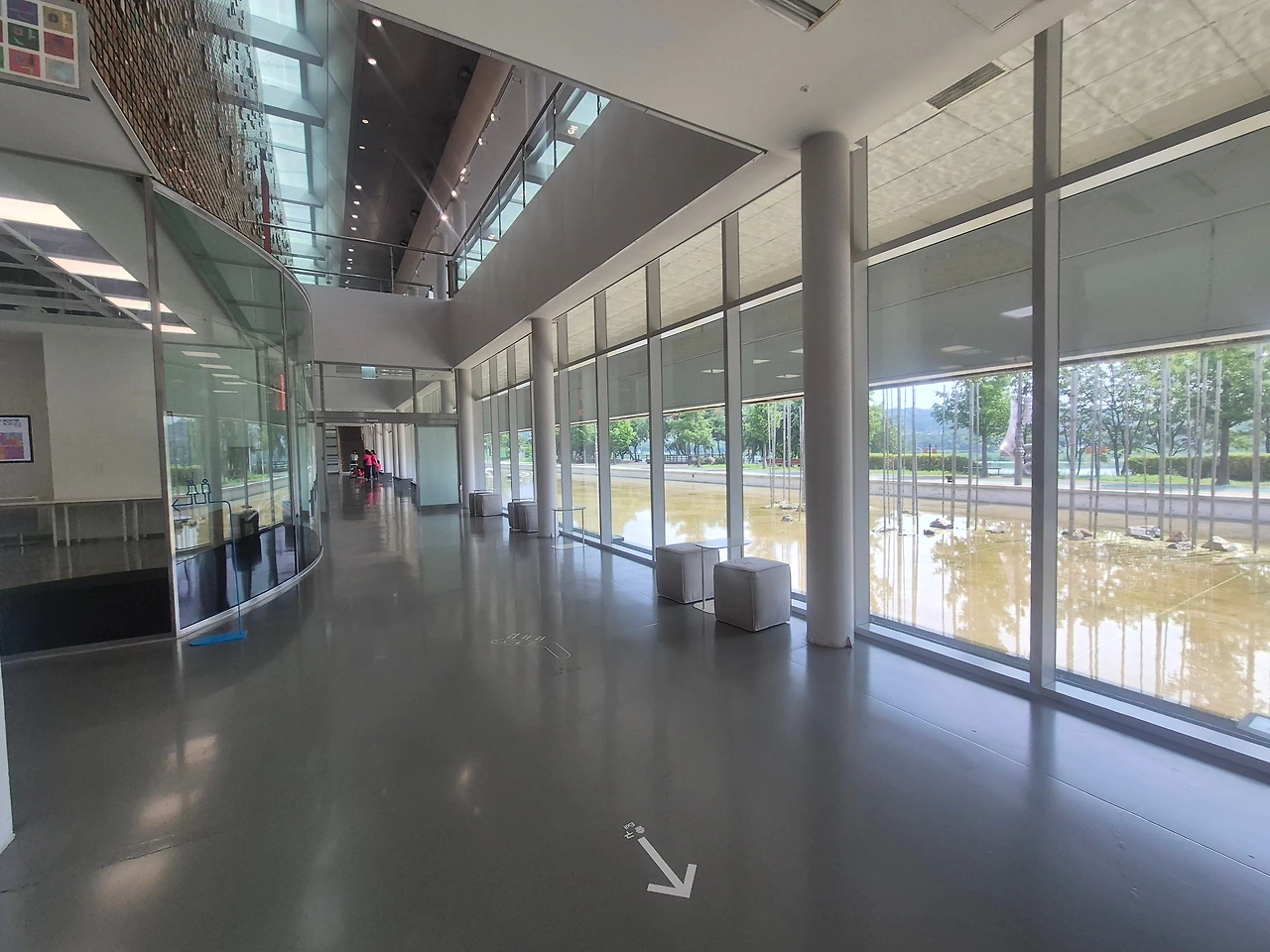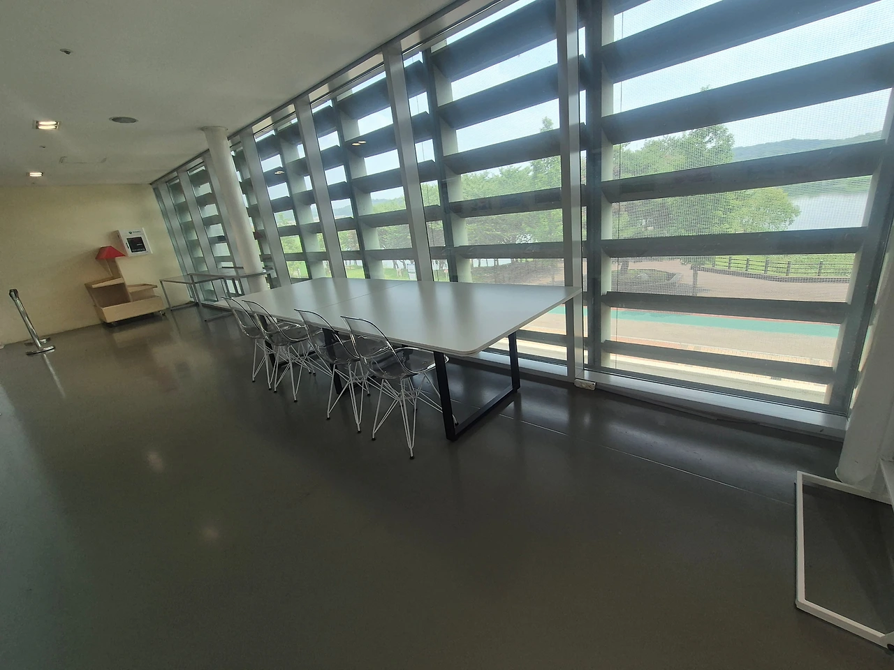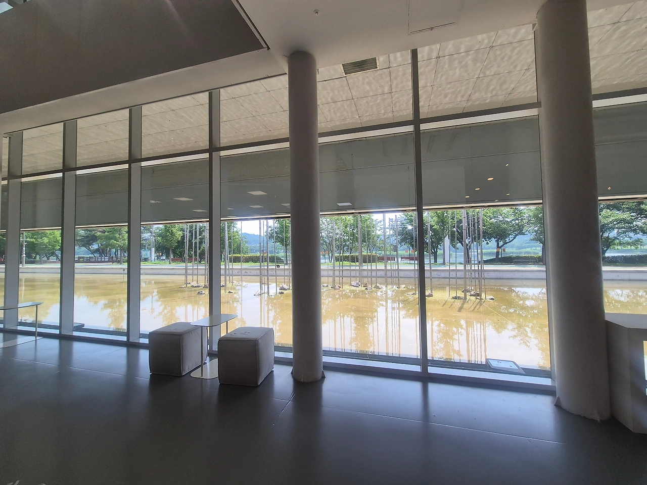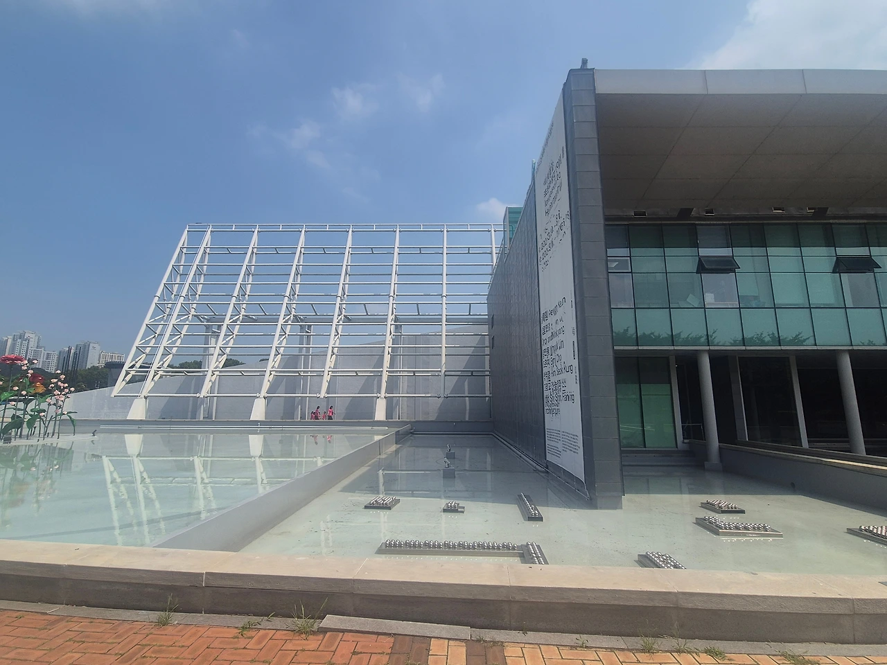 그때가 경기도립 초기 개관때 였으니까 벌써 20년 지났지만 이 미술관은 지금도 디자인이 낙후되어보이진 않는다. 3만평 산마루 공원에 비해, 10배까지는 아니고 20만평 유원지 속에, 2천평의 연면적으로 2층으로 지어진 미술관~! 지하는 없고 수장고가 반지하로 형성되어있다~. 연면적의 10프로~15프로 비율을 차지하는 수장고~
