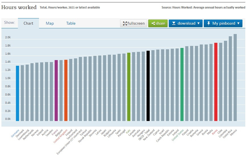 우리나라는 아직 OECD 국가 중 근무시간이 멕시코, 코스타리카, 콜롬비아, 칠레에 이어 5번째로 많은 나라로 기록되고 있다. 우리나라가 근로 실적을 내는 데 있어 이토록 양으로 승부하는 나라인 줄은 몰랐는데 상당히 실망스럽다.