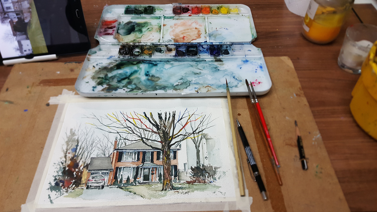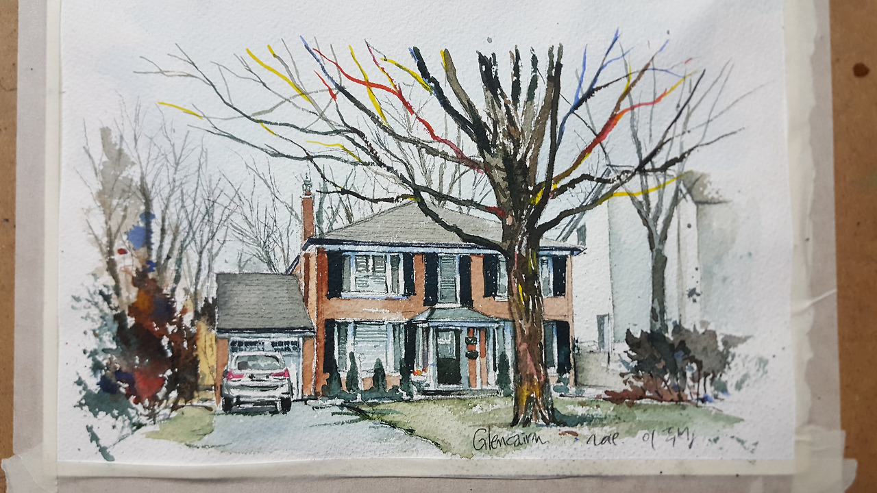 아름다운 집들이 진열되어 있는 길로 접어들었다. 글렌케언(Glencairn) 길. 이상하게 기시감이 드는 길이다. 그 길의 모퉁이에 유독 눈길이 가는 아름다운 집 하나가 눈에 들어왔다. 그 집의 담장은 언제든 드나들 수 있는 따듯함일 것이란 생각이 든다. 이 세상에 홀로 남겨진 것 같은 느낌으로 낯선 거리를 걷고 있는 막막함 속에 저런 분위기로 나를 보듬는 느낌은 어쩌면 스스로 일으켜 세우는 힘을 주며 세상이 신뢰를 승인해주는 기분이 들게 하는 집이다. 이 거리의 바람이 나무들의 손을 잡아 흔들며 신비한 춤을 추고 있다. 그 바람이 추상화시킨 풍경들. 이 낯선 동네를 하염없이 지나는 겨울바람을 받아서 스케치북에 정성스럽게 적고 싶었다.