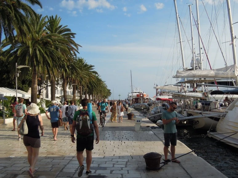 요트와 바다, 높게 뻗은 야자수와 북적이는 사람들.
