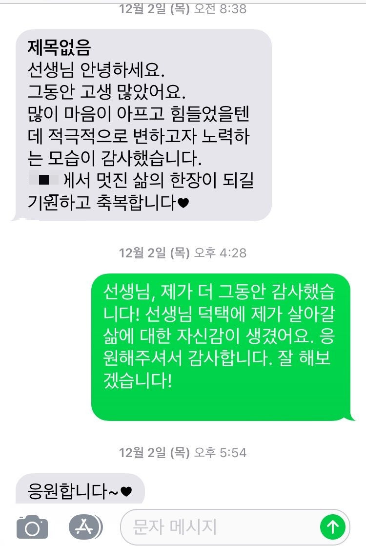 그 이후로도 상담 선생님을 매주 만날 때 경계하는 마음이 없어진 것은 아니었다. (나는 성격 상 정말 친한 친구들에게도 가족들에게도 나의 진짜 커다란 아픔과 고민을 잘 털어놓지 못하는 사람이다.) 내가 머뭇거릴 때면 선생님은 종종 자기 이야기를 하기도 했다. 나보다 몇 살 아래의 따님이 파혼(...)한 이야기도 해주셨다. 본인이 하고 있는 업인 상담 일이 너무 감사하고 행복하다고 말씀하기도 했다. 5회기가 넘어가면서는 참고 참던 눈물을 펑펑 흘렸다. 원래 만남은 총 10회기였으나, 코로나 방역 문제 등으로 마지막 한두 차례는 선생님과 만나지 못한 채 종료되었다. 그 사이 재외 한국학교 교사 합격자 발표도 났다. 아래 문자는 선생님과 나눈 마지막 대화이다.