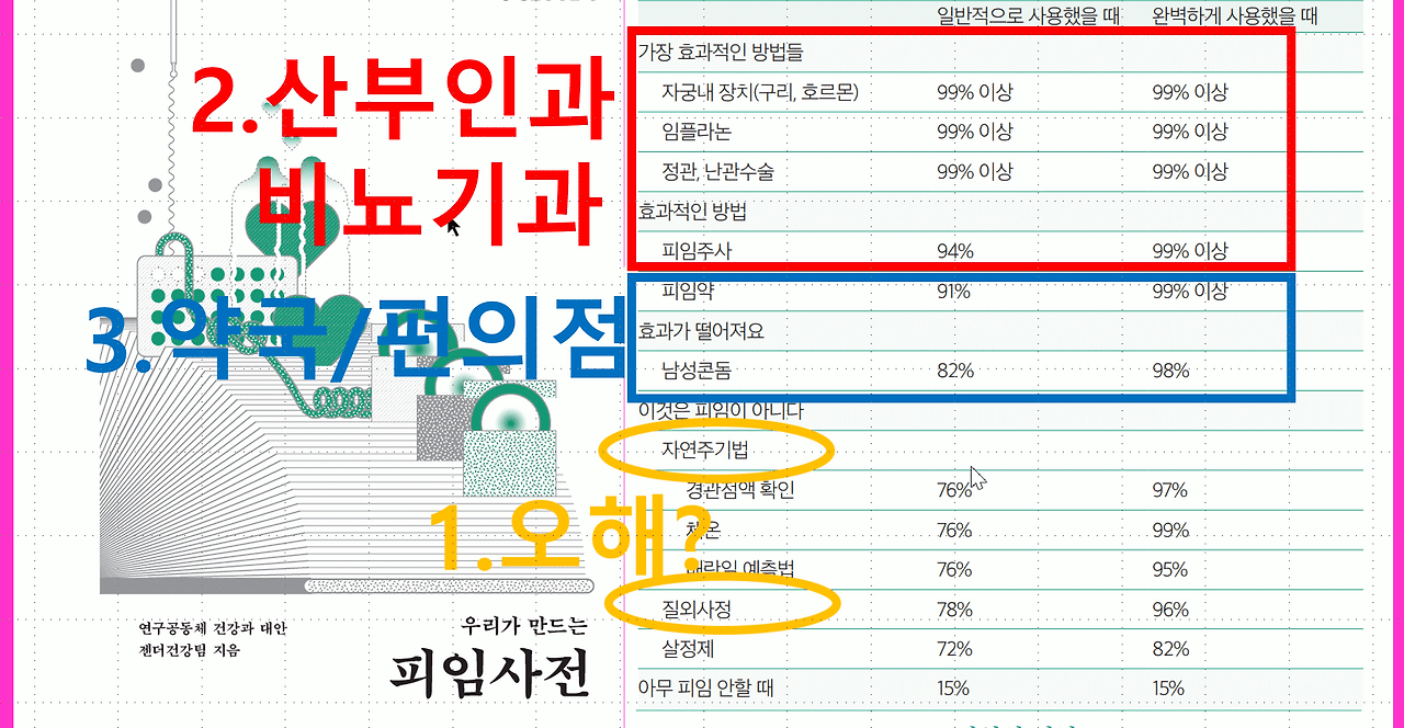 다음으로는 피임에 대한 다양한 방법에 대해 알아보았다. <우리가 만드는 피임 사전(제2판)>(클릭 시 사이트로 이동) 자료를 활용했다. 이를 편집하여 학습지로 사용했고, PPT로도 구성했다. 먼저 산부인과나 비뇨의학과 등에 방문하여 받을 수 있는 피임 방법에 대해서 강의했다. 약국에서 살 수 있는 경구 피임약 복용방법에 대해서도 언급했다. 자연주기법의 의미 및 계산 방법, 피임 실패 확률, 그리고 질외사정법의 의미 및 피임 실패 확률에 대해서도 공부했다. 이론적인 부분인데도 아이들은 또렷또렷했다. 혼자서 몰래 검색하며 찾아보는 것보다 수업 시간에 공개적으로 공부하는 것이 낫다고 판단했는데, 다행히 아이들은 이런 내 마음을 이해해준 것 같았다.