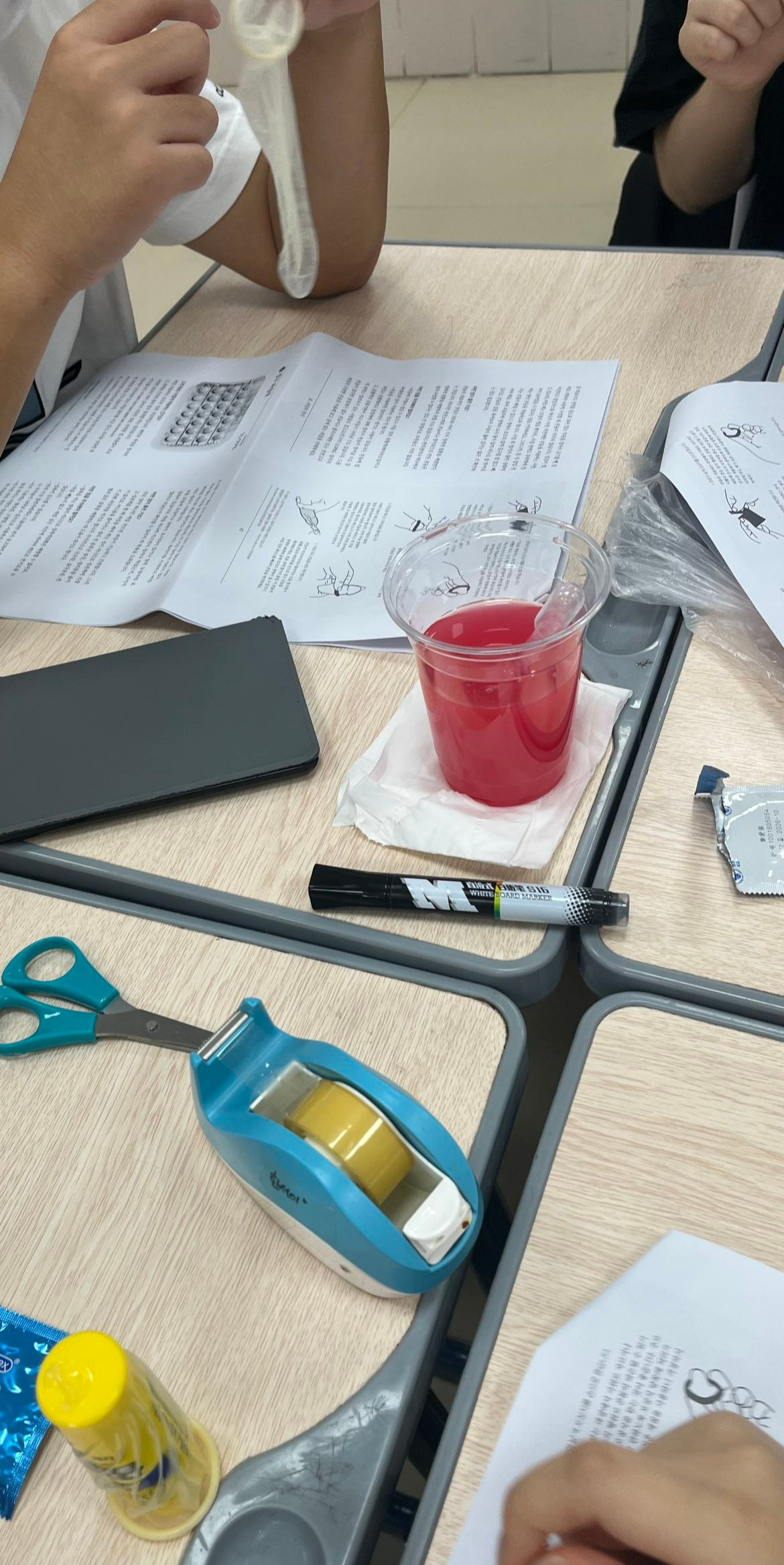 드디어(?) 남성콘돔을 개봉해보도록 했다. 그전에 모든 학생에게 손부터 씻고 오라고 했다. 그리고 남녀가 섞일 수 있도록 모둠을 구성했다. 콘돔 포장지 뜯는 것부터 아이들은 신기해 마지않았다. <피임 사전> 책자에 콘돔 착용법이 소개되어 있는데, 꼭 이 절차를 따라달라 당부했다. 책자에는 콘돔에도 앞뒤가 있으며, 반드시 콘돔 상단부에 공기를 빼고 착용해야 한다고 강조되어 있다. 아이들은 그것을 이리저리 살폈다. 무언가를 넣어보기도 하고, 어디까지 늘어나는지 있는 힘껏 당겨보기도 했다. 생각보다 진지하게 임해준 학생들이 너무 고마웠다.
