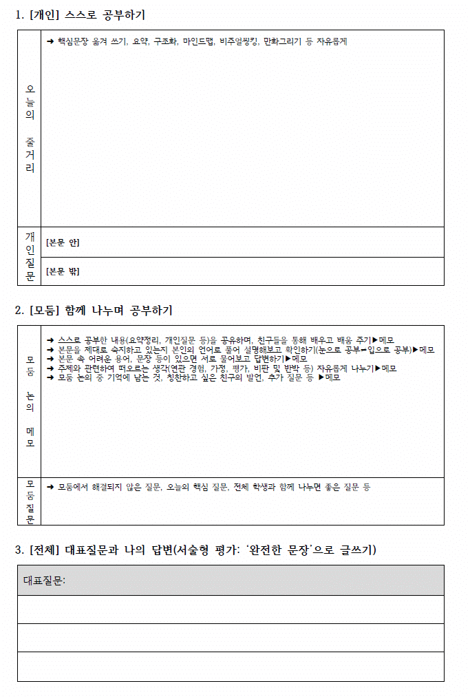 2. [모둠] 모둠원과 함께 메모한 내용이나 개인 질문을 공유한다. 이 중에서 모둠원이 의논하여 가장 좋은 질문을 하나 뽑는다. 이를 '모둠 질문'으로 명한 후 학습지에 기록한다. 그리고 칠판에 모둠 질문을 쓴다.