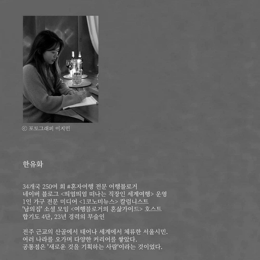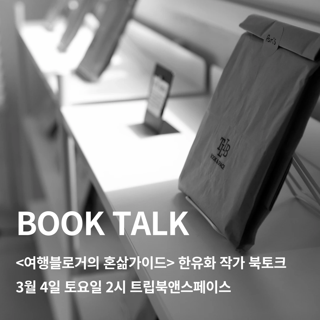 트립북앤스페이스 북토크 신청서 안녕하세요. 여행서점 트립북앤스페이스입니다. 저희 서점은 여행작가님과 함께 하는 북토크를 진행하고 있습니다. 3월에는 혼행 여행전문 블로거인 한유화 작가님의 <여행블로거의 혼삶가이
