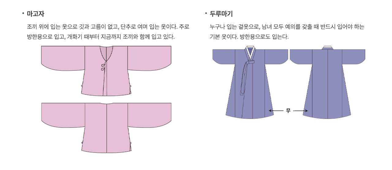 두루마기는 외출용 겉옷으로 긴 코트처럼 입어요.