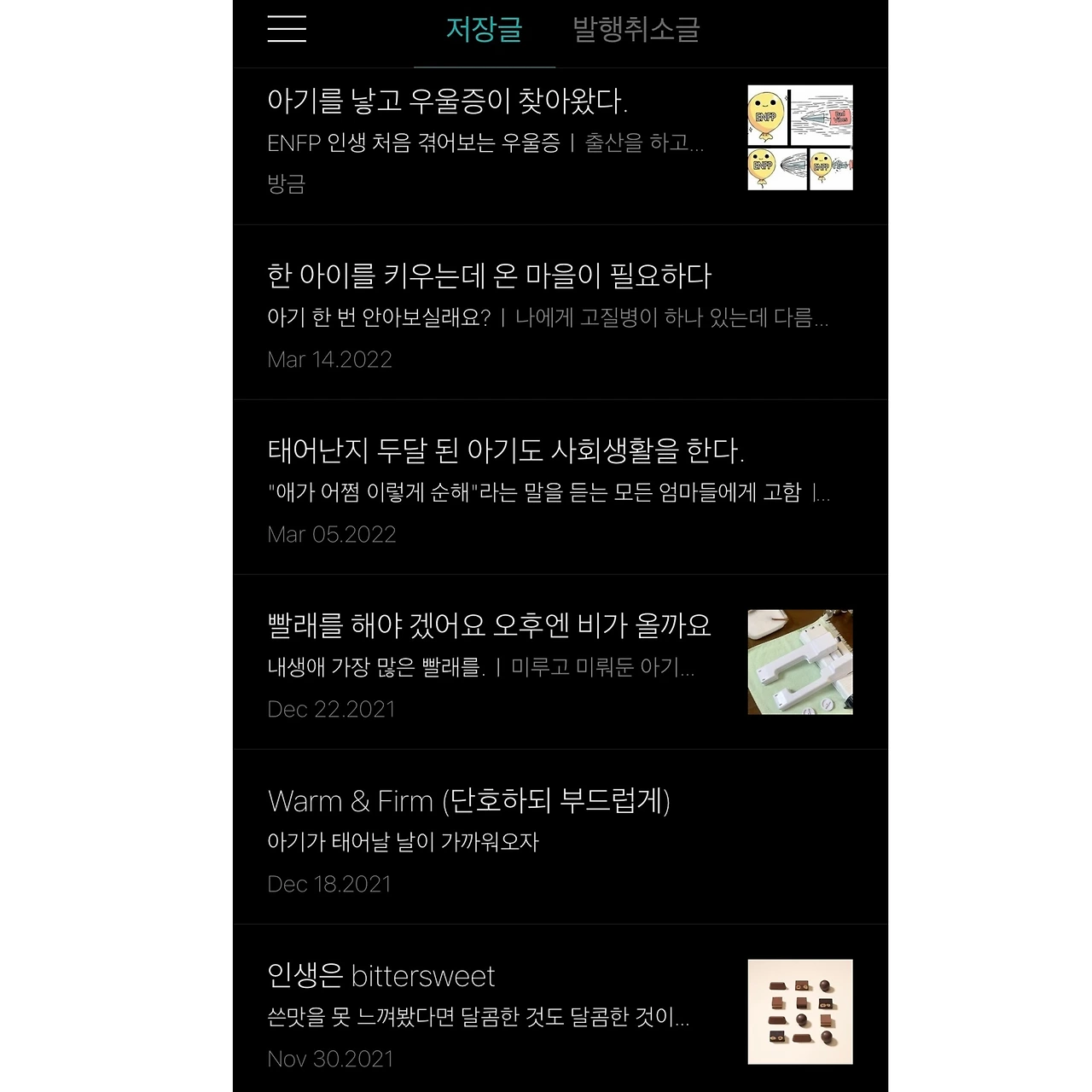 쓰고 보니 많이 우울한 것 같네 찡. 사실 힘든 것만 있는 건 아닌데. 며칠간 손목의 통증이 극에 달한 나머지 어깨까지 아프고, 또 육아 동지와 일련의 갈등이 생겨 더 그런 것 같다. 또 할 일들이 밀려서도. 봄맞이 집 대정리도 그렇고, 브런치에 쓰려던 글들도 매번 적다가 미완성된 채 임시저장 글로 남아있다. 멀티가 되지 않는 터라 글쓰기도 한두 시간 바짝 집중해서 써야 하는데 쓰다가 아기가 칭얼대면 달래주고, 수유 시간 되면 맘마 먹이고. 그렇게 쓰다 말다한 글은 원래의 감정이나 쓰고자 했던 단어들이 흐릿해져 버린다. 또 성격이 급한 편이라 빨리빨리 하는 걸 좋아하는데, 내 뜻대로 되지 않아 아기와 외출이라도 할 때는 세 배로는 걸린다. 아무래도 아기가 들어온 일상에 아직은 적응하지 못해서 인 것 같다.
