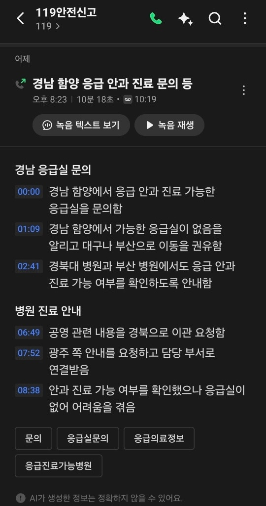 가장 가까운 도시인 진주 경상대 병원으로 향했다. 그러면서 안과 진료를 받을 수 있는지 검색하고 또 했다. 문득, ‘아 119에 문의해야겠다!’라는 생각이 스치며 당장 남편에게 119에 전화해 보라 했다. 119에 전화했더니 상황실에서 경남 119 센터로, 또 센터에서 병원이랑 연결되어 있는 부서로 전화를 몇차례 전화를 돌려주었다.